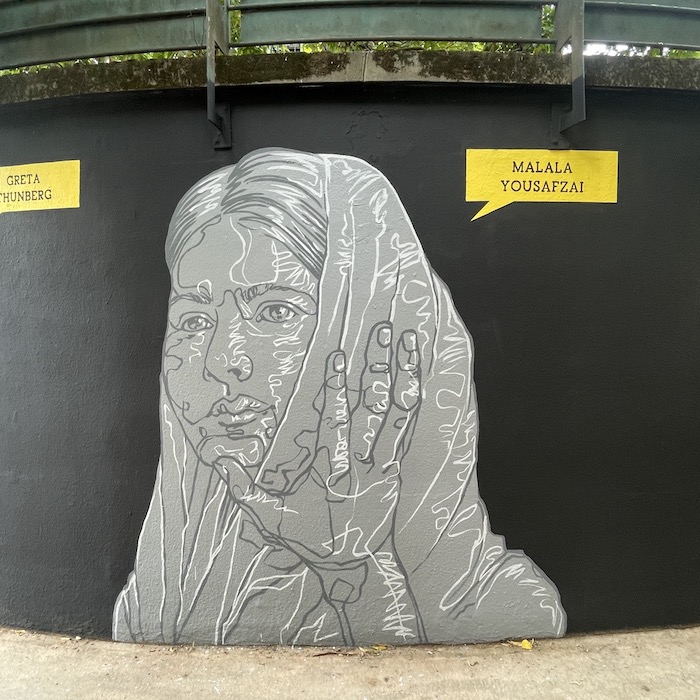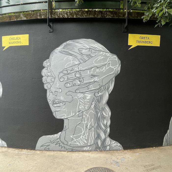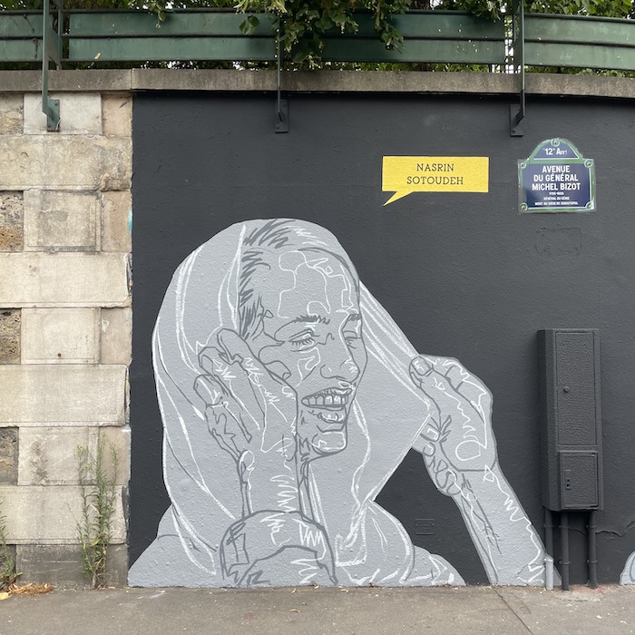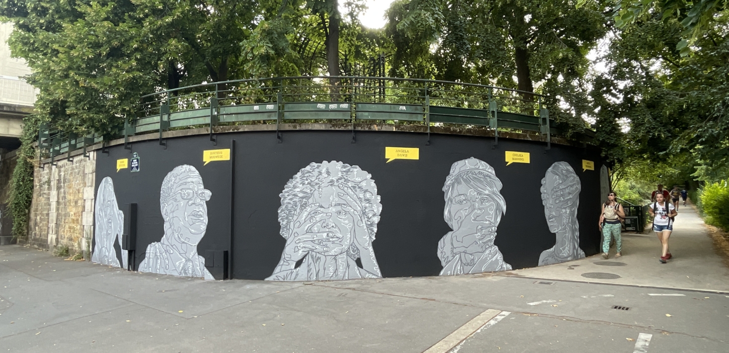 C’est un long mur de 20 mètres de long sur 5 mètres de haut sur lequel six portraits éclatent comme des cris. Quelques minces traits de blanc tranchant sur un mur sombre et des visages soutenus ou contraints par des mains amicales ou hostiles. L’une ajuste un voile sur la tête de l’avocate Nasrin Sotoudeh. L’autre est posée sur l’épaule du docteur Mukwege. D’autres encore cachent les yeux, obstruent une bouche, soutiennent un visage, un cou. Des mains comme des signes de solidarité ou d’oppression envers les courageux·ses défenseur·es des droits humains que célèbre ce mur, le premier dédié aux droits humains de la capitale. Un espace symbolique mis à disposition par la Mairie de Paris pour célébrer les libertés, promouvoir les droits fondamentaux et lutter contre toutes les discriminations.
