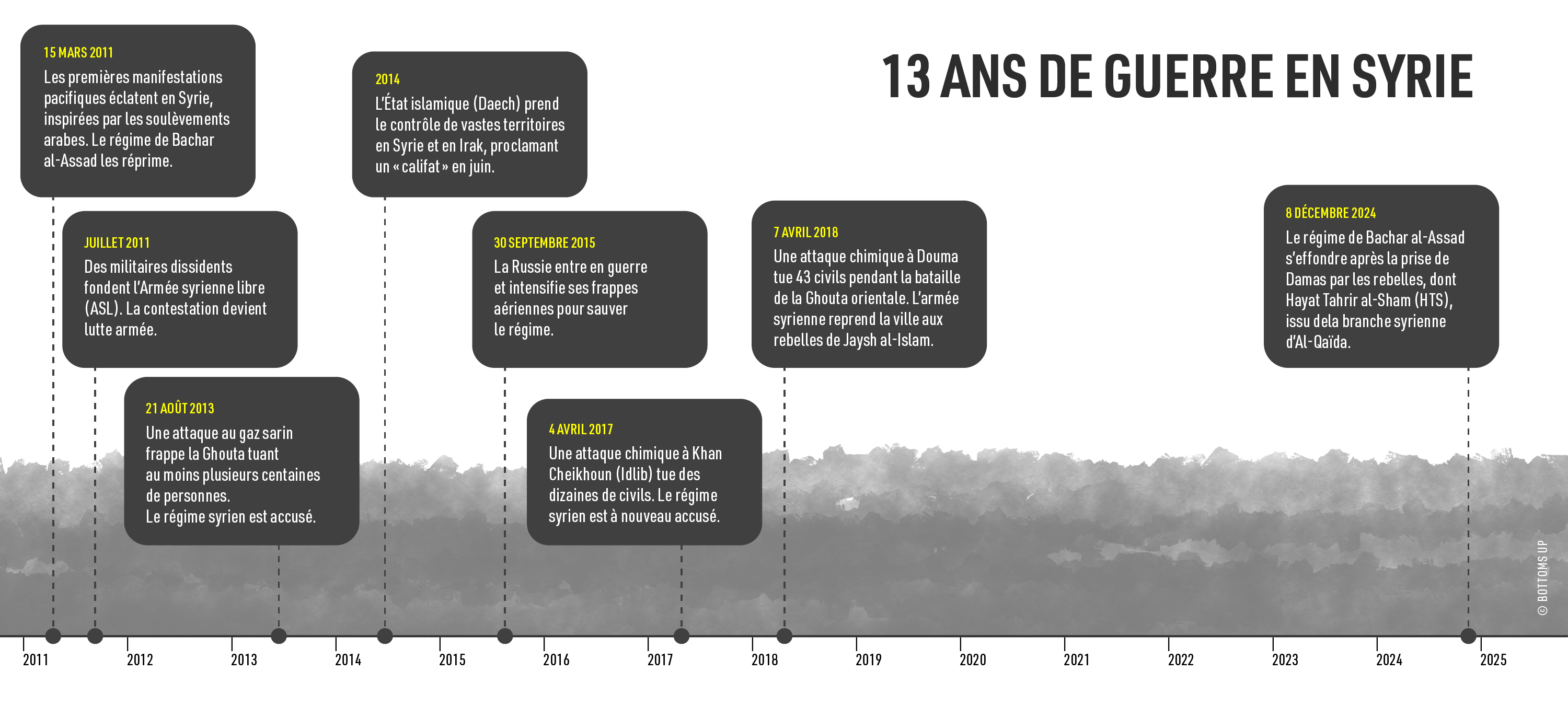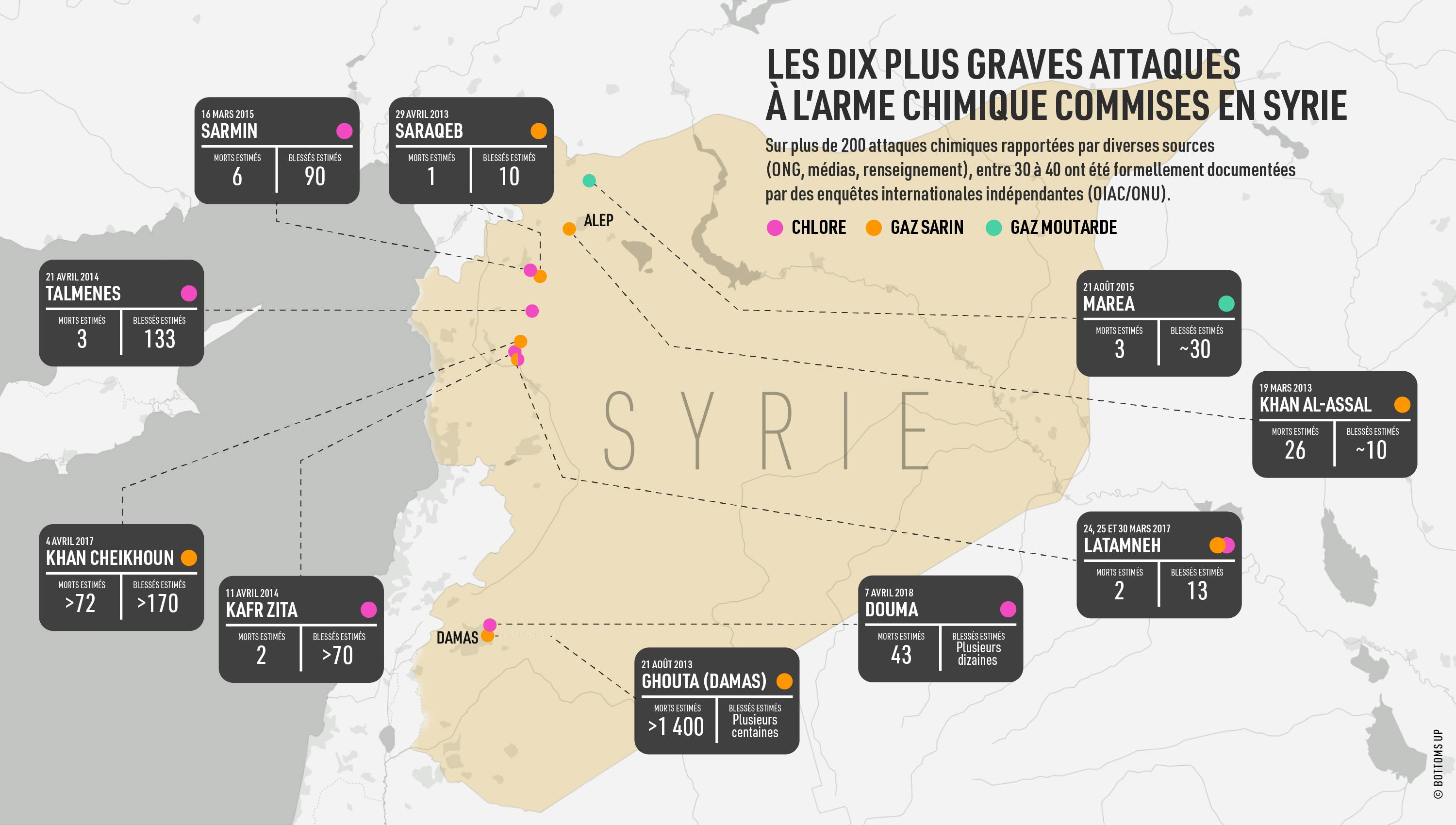 Pendant la guerre civile syrienne, plusieurs armes chimiques ont été utilisées : sarin, chlore, gaz moutarde. La quasi-totalité des attaques – entre 200 et 300 selon les ONG et les services de renseignement occidentaux – est attribuée au régime syrien, principalement avec du sarin et du chlore. Daech a mené au moins cinq attaques confirmées au gaz moutarde, dont une à Marea (province d’Alep) en septembre 2015. Quant aux groupes rebelles, ils sont soupçonnés d’avoir utilisé du chlore, mais aucune preuve irréfutable n’a été produite par les enquêtes internationales.