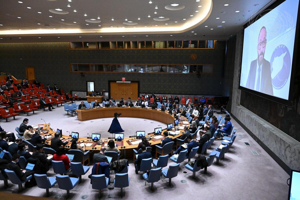 New York, 5 décembre 2024. Le processus d’élimination des armes chimiques en Syrie est à l’ordre du jour de la réunion du Conseil de sécurité des Nations unies. L’intervention de Nidal Shikani, le directeur du Centre de documentation des violations chimiques de la Syrie (CVDCS) est retransmise sur les écrans.