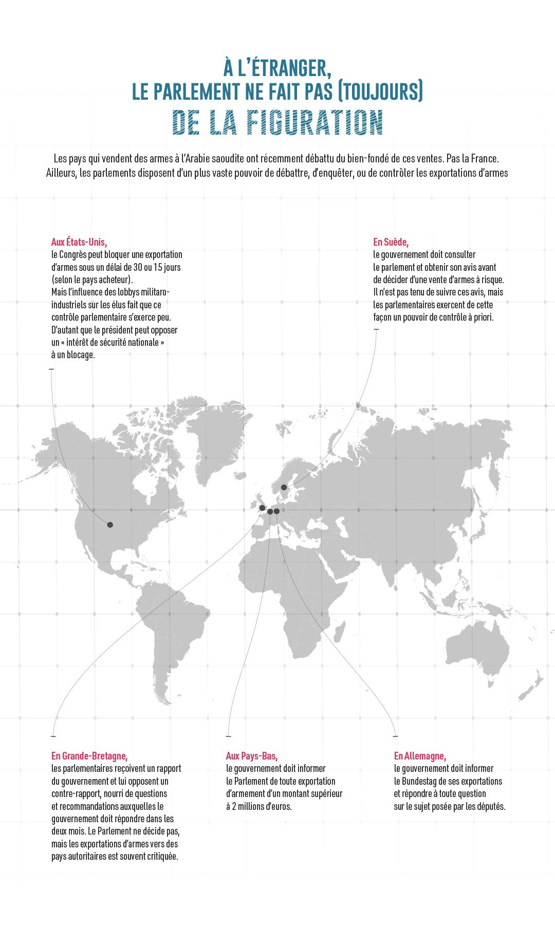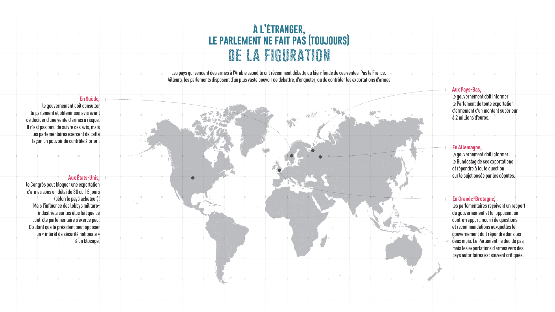 Les pays qui vendent des armes à l’Arabie saoudite ont récemment débattu du bien-fondé de ces ventes. Pas la France. Ailleurs, les parlements disposent d’un plus vaste pouvoir de débattre, d’enquêter, ou de contrôler les exportations d’armes.