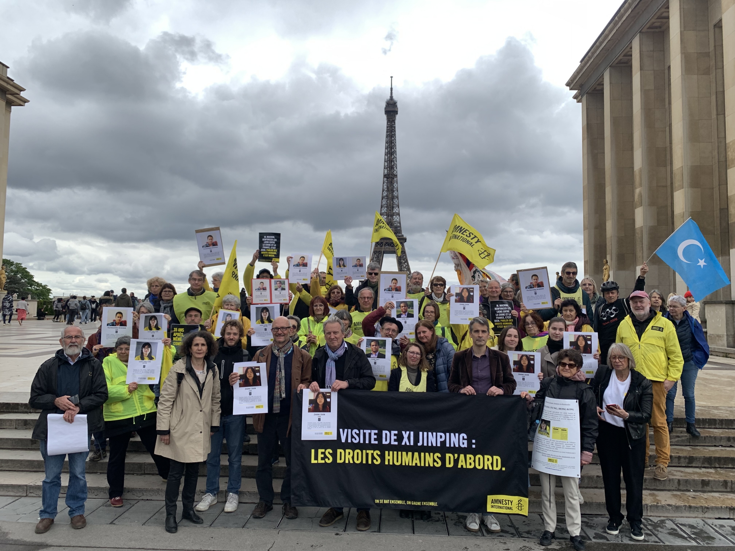 Rassemblement de militants et militantes d’Amnesty International France, le samedi 4 mai 2024, sur le Parvis des Droits de l’Homme à Paris, pour mettre en lumière la situation catastrophique des droits humains en Chine.