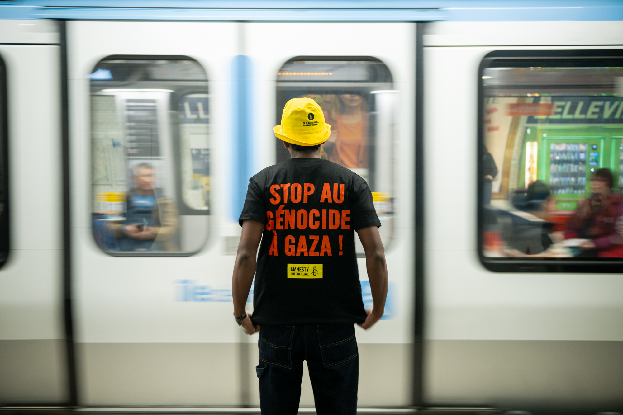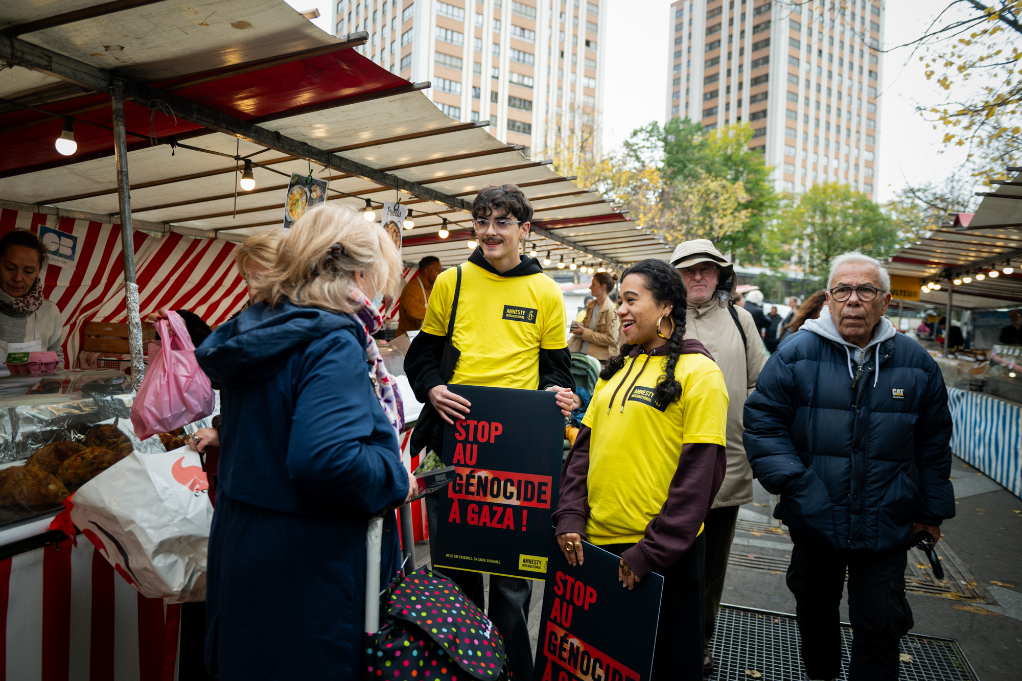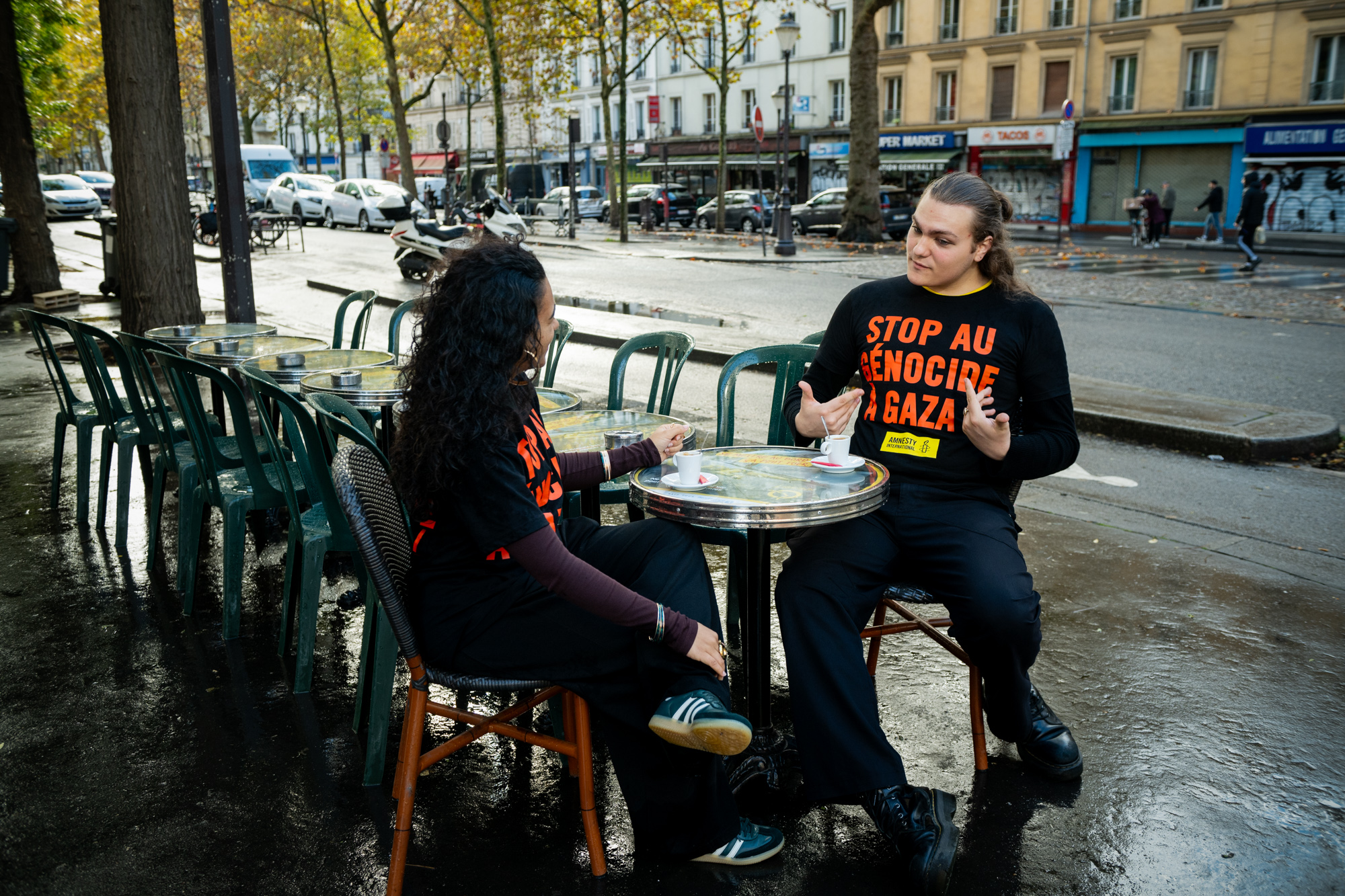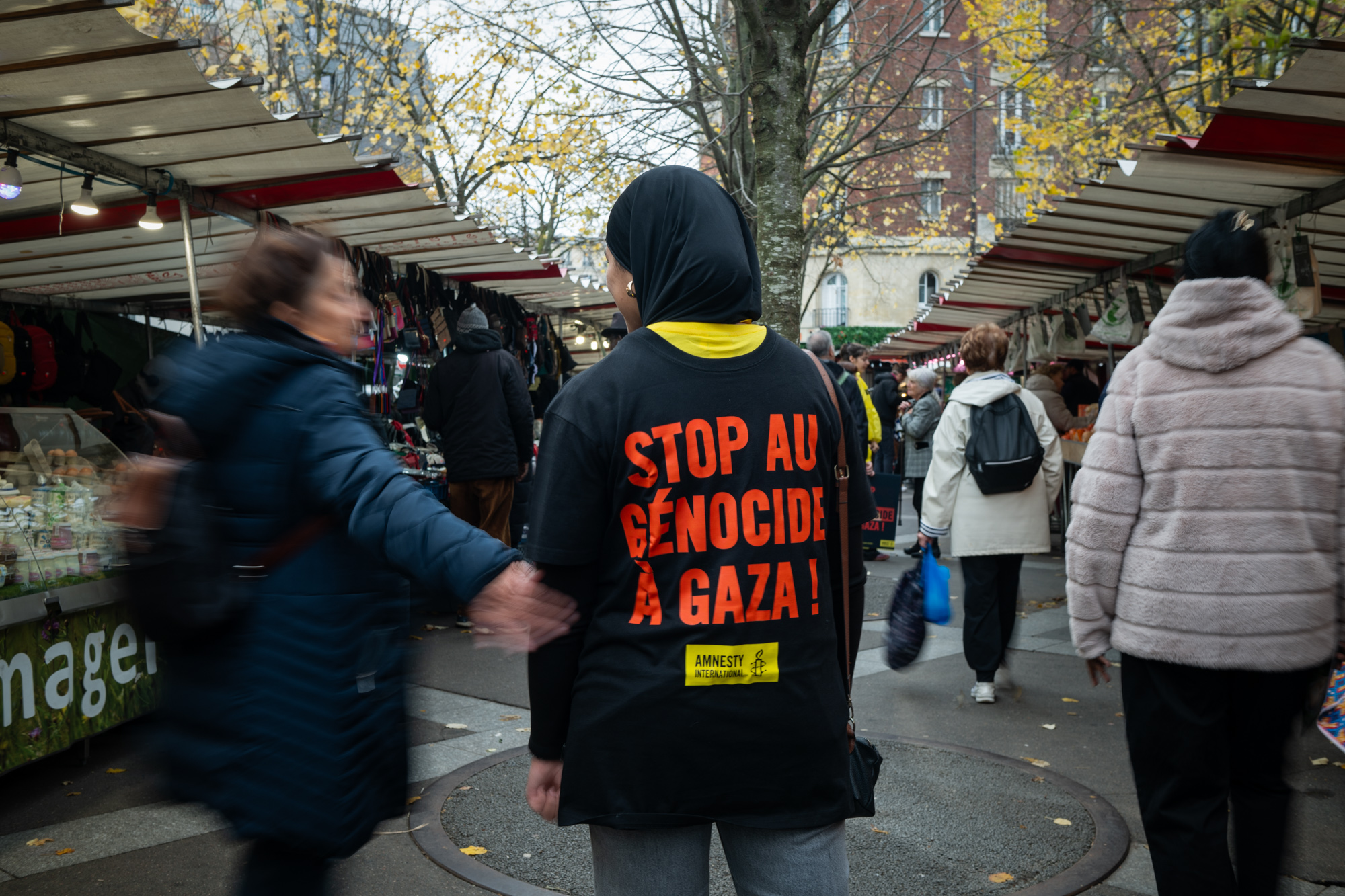 En ce dimanche matin pluvieux, le moral des équipes demeure au beau fixe. Elles sont impatientes de mener l’action de rue en soutien à Gaza. Le rendez-vous est donné à Place des Fêtes. Ils et elles brandissent des t-shirts et pancartes aux messages simples mais forts : « Justice pour Gaza ». « Stop au génocide ». Dans le métro, à la terrasse des cafés, sur le marché… pas toujours simple d’évoquer la question du génocide à Gaza dans l’espace public. Les réactions sont contrastées. Parfois houleuses.