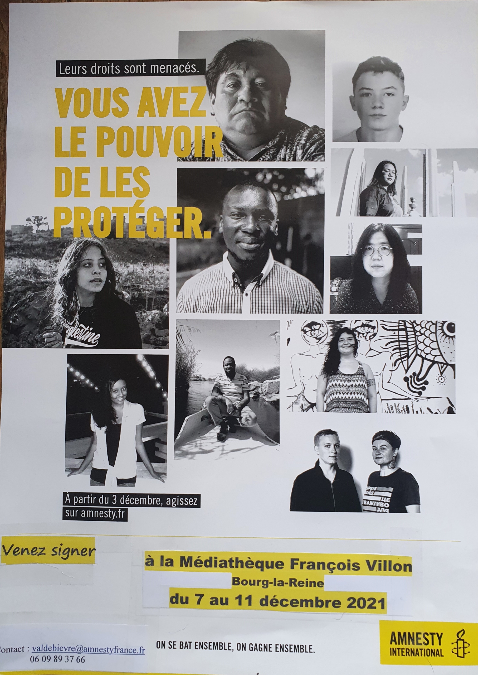 Exposition sur les droits des femmes, affichage des 10 cas des personnes dont les Droits Humains ne sont pas respectés, table de presse, pétitions à signer et présence sur certaines plages horaires de membres du groupe local « Val de Bièvre » d’Amnesty International. Médiathèque François Villon.