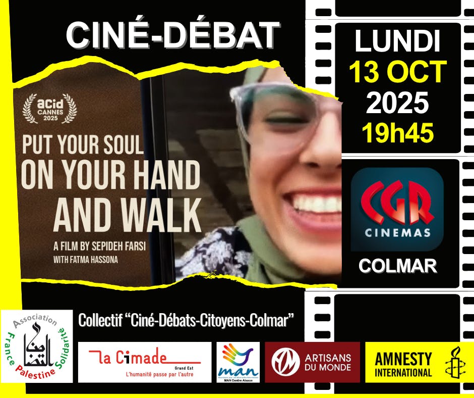 Ciné-Débats-Citoyens-Colmar : c’est parti ! Lundi 13 octobre à 19h45 – Cinéma CGR Projection du film « Put your soul on your hand and walk » suivie d’un débat animé par France Palestine Solidarité (AFPS) et Amnesty International. Un moment d’échange, de réflexion et de solidarité, initié par Amnesty International, Le MAN, La Cimade, Artisans du Monde et l’AFPS. Venez nombreux pour ce RDV citoyen !