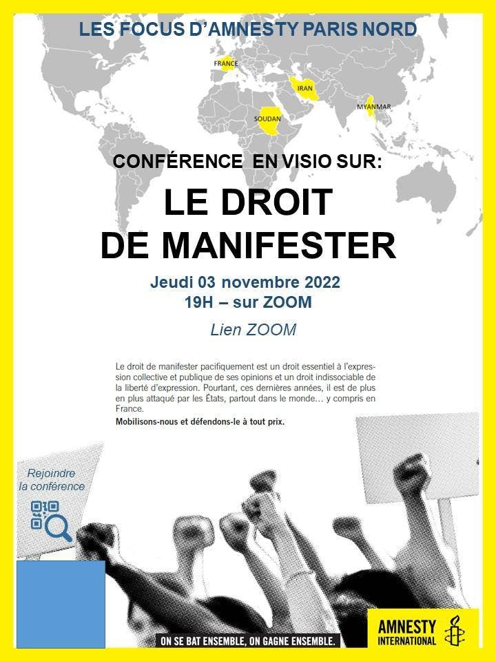 Le droit de manifester est-il en danger ? Le droit de manifester est un droit fondamental et la possibilité pour chaque individu, de faire prévaloir ses droits. Les manifestations permettent de réunir, de créer un espace de débat public et d’engagement politique. Attaquer le droit de manifester, c’est empêcher, c’est museler, c’est faire vaciller les autres droits humains. Des innocent.es meurent aujourd’hui pour avoir manifesté pacifiquement, d’autres sont emprisonnés, d’autres encore sont mis en garde à vue. Les mesures restreignant le droit de manifester sont nombreuses : recours à la force, surveillance massive et ciblée, censure, violence et stigmatisation. Aucun pays aujourd’hui n’est épargné par la menace qui pèse sur le droit de manifester. Nous vous invitons à vous informer sur la situation en France, au Soudan, en Iran, et au Myanmar. Rencontrons-nous à distance le jeudi 3 novembre à 19h00 pour en débattre. Nous aurons le plaisir d’accueillir l’association Doh Atu Ensemble pour le Myanmar et des militant.e.s d’Amnesty spécialistes de l’Iran et du Soudan. Pour participer, lien de connexion https://us02web.zoom.us/j/82267855437?pwd=OFZGaE1TTjBtSzBPMkxKcC9VQnl6Zz09 Les Focus d’Amnesty Paris Nord sont des rendez-vous virtuels pour faire un gros plan sur une problématique des droits humains. Le but est d’apporter l’éclairage d’expert.es et d’engager un débat via le chat. Les Focus sont co-organisés par les groupes d'Amnesty International du 17e, du 18e et du 19e arrondissement de Paris. Ils ont lieu tous les deux mois – sauf période estivale – sur zoom, en début de soirée. Conférence gratuite sans inscription préalable