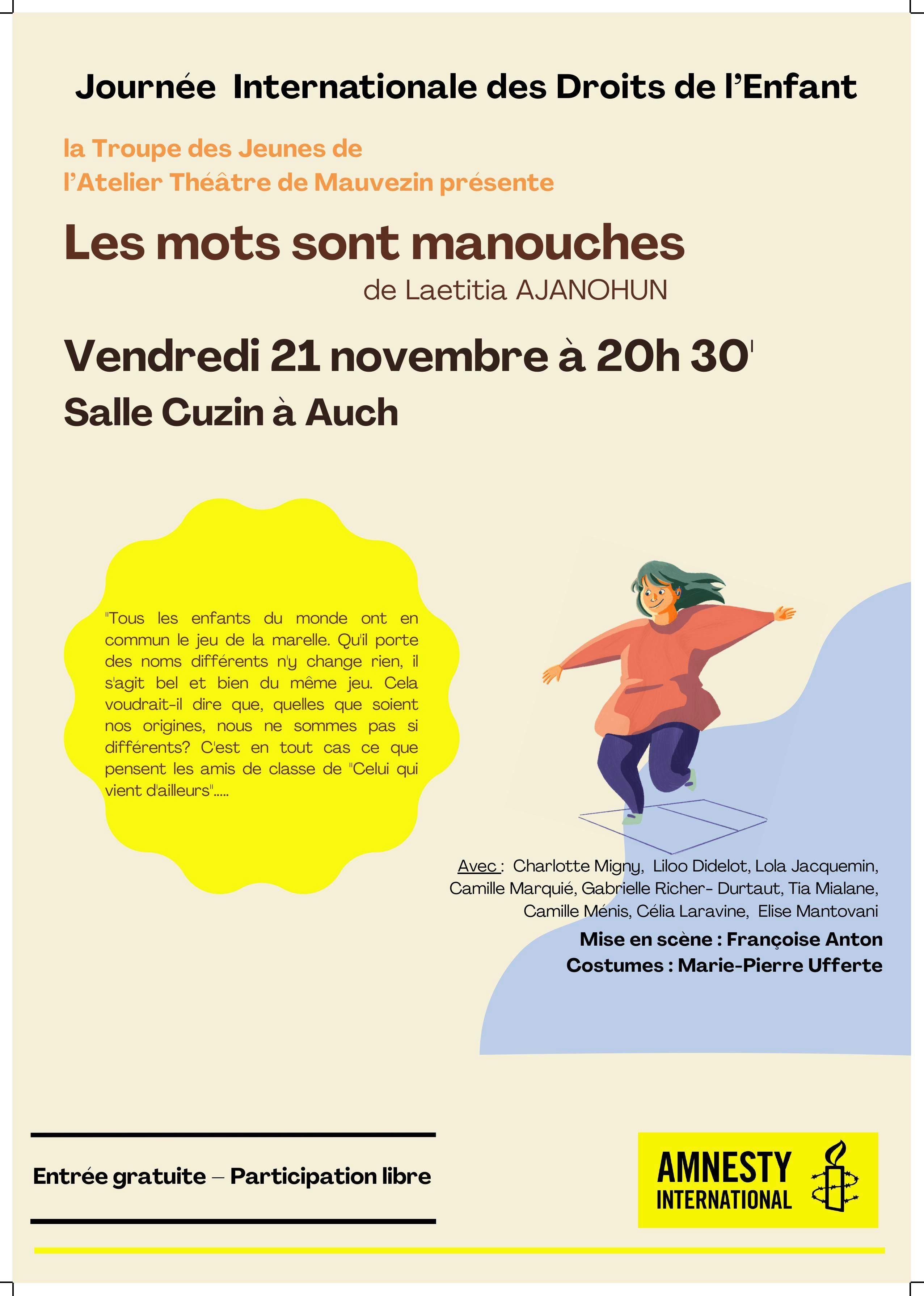 Les enfants et jeunes de l'Atelier théâtre de Mauvezin (Gers) animé par Françoise Anton joueront. 14h15: chants par des élèves 14h30: pièce de théâtre en direction des scolaires: "les mots sont manouches" par les jeunes de la troupe de Mauvezin(32) 20h30" les mots sont manouches " de Laetitia Ajanohun