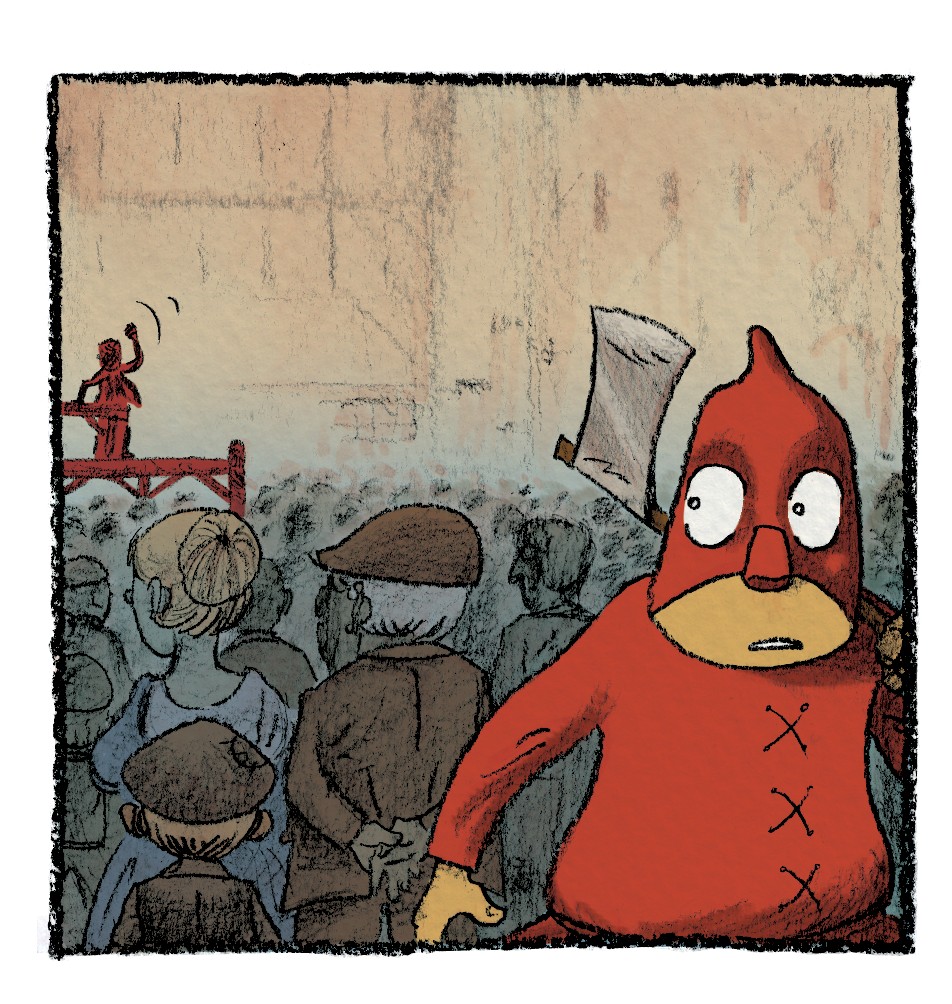 3- À partir de l’image en noir et blanc et sans fond (imprimée ou dessinée), recrée une autre histoire dans un monde sans hache et sans échafaud, et imagine tout ce que le personnage pourrait faire d’autre. Dessine, peins, colle…. Laisse libre cours à ton imagination.