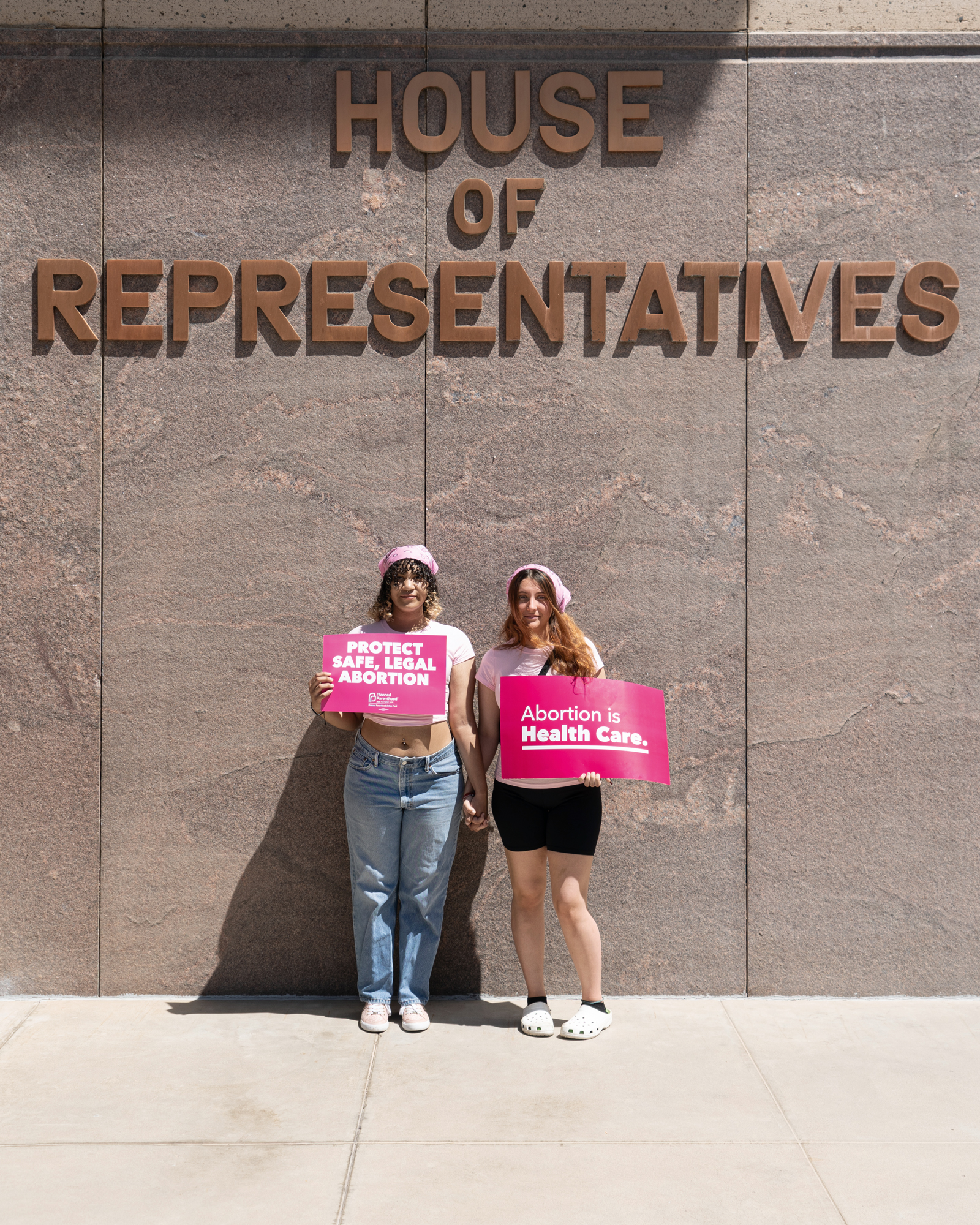 « Pour un avortement sûr et légal » et « L’avortement est un soin de santé » : Amirah Coronado et Lexie Rodriguez posent avec leur slogan devant le Sénat de l’Arizona, le 1er mai 2024.