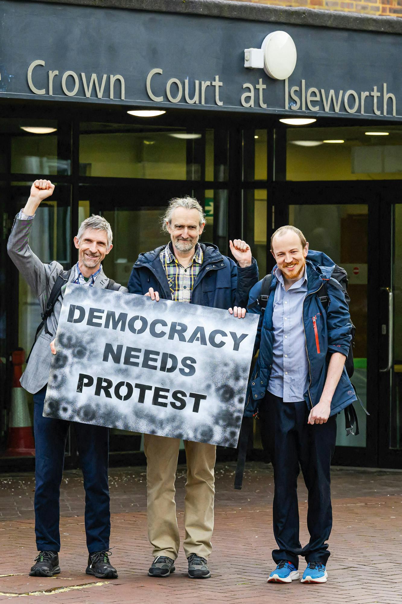 Londres, 5 avril 2024. Roger Hallam (au centre). 5 ans de prison pour un blocage routier © LEON NEAL/GETTY IMAGES EUROPE/Getty Images via AFP