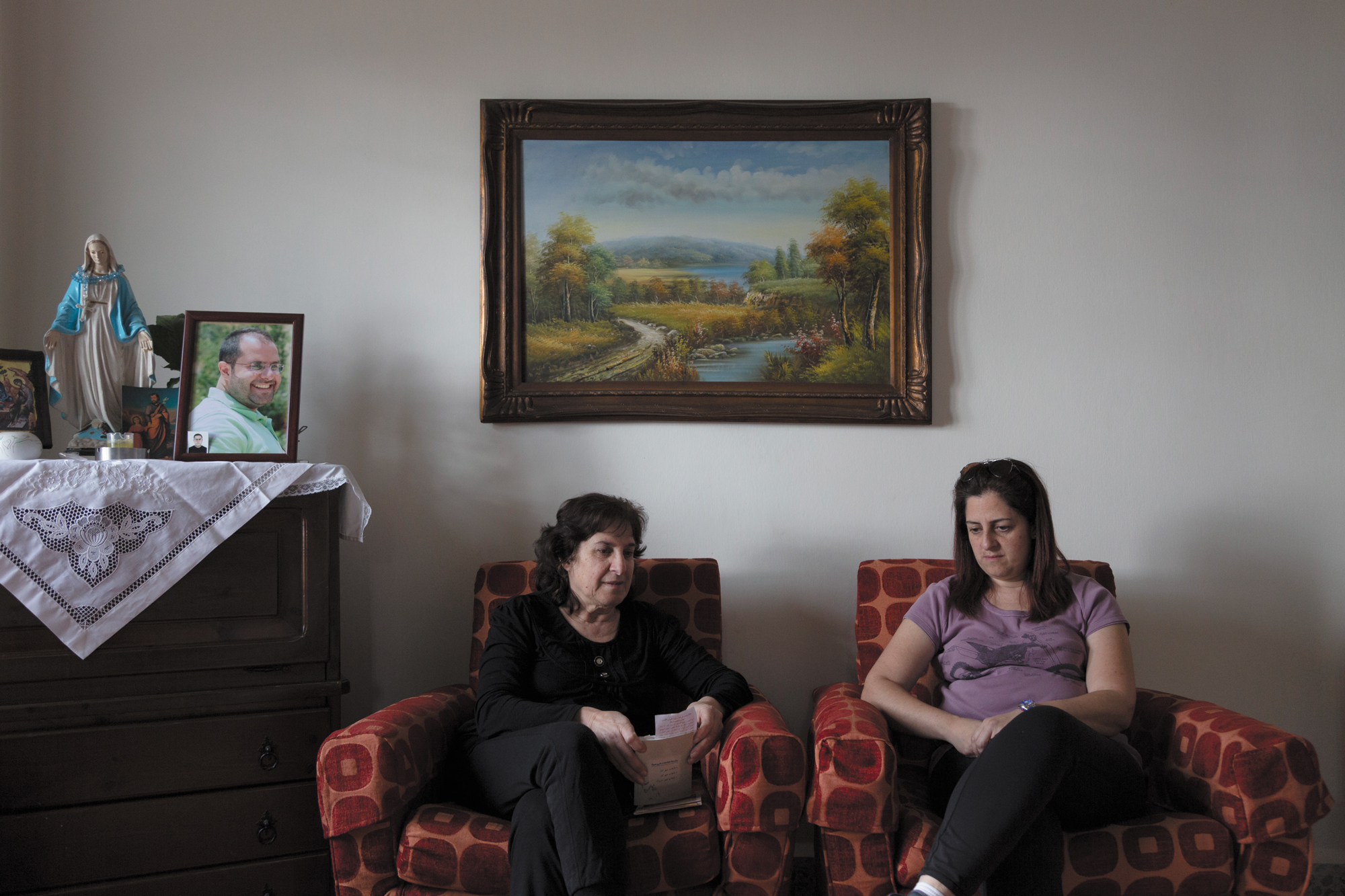 Aml Bejjani, à gauche, la mère de Joe Bejjani assassiné, assise à côté de sa fille Doris dans le salon de son appartement à Kahale, à l’est de Beyrouth. Sur la gauche, un portrait de Joe est placé à côté d’une statue de la Vierge Marie. 25 avril 2023.