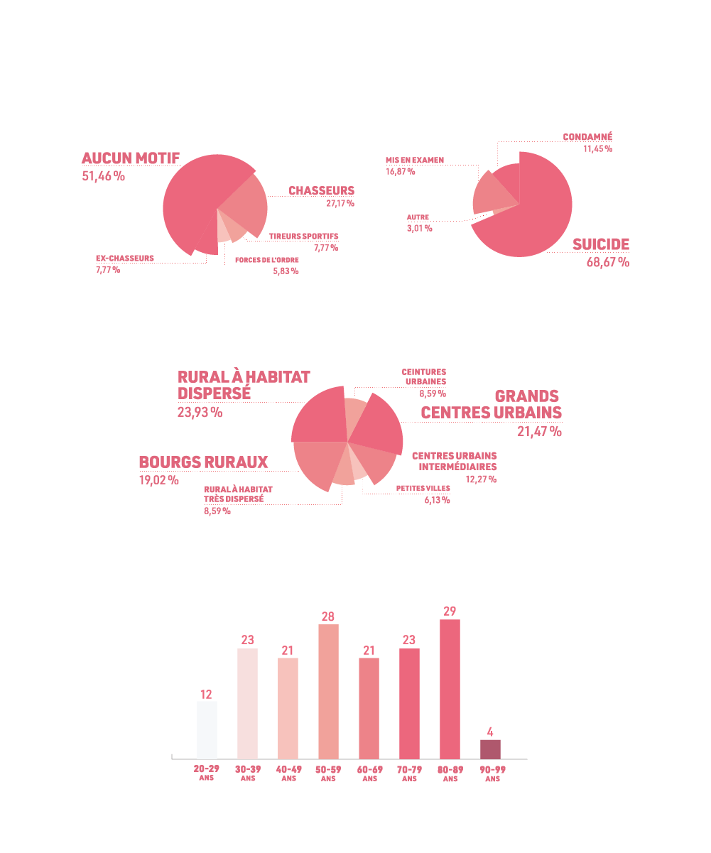 De manière générale, aux assises, la question de la possession comme celle de la provenance d’une arme à feu par l’accusé semble peu approfondie : nous n’avons répertorié qu’un seul cas de mise en examen pour « détention d’armes et de munitions de catégorie B », après le féminicide d’une jeune Danoise dans le sud de la France. À la différence des autres modes opératoires, lors des procès, la défense avance très souvent la thèse du tir par accident. Mais la plupart du temps, il n’y a pas de procès : 69 % des hommes se suicident à l’issue du passage à l’acte, entraînant la clôture de l’action publique. Selon nos données, une moitié des hommes n’avaient aucune raison évidente de posséder une arme à feu, n’étant ni chasseur, ni membre des forces de sécurité, ni tireur sportif.