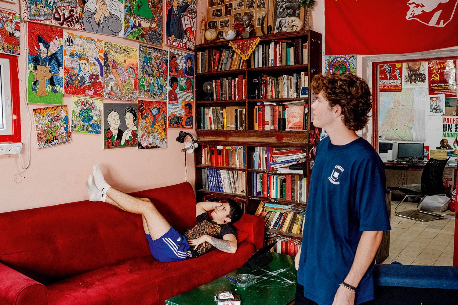 Au deuxième étage, dans l’une des salles communes, les murs sont recouverts de ses œuvres, des tableaux bigarrés dépeignant les crimes de l’occupation et les conséquences des guerres successives à Gaza. Face aux réactions hostiles de la société israélienne, les jeunes activistes fréquentant le Left Bank sont désormais prudents. Sur la façade du bâtiment, les affiches en arabe ont été retirées. « On fait attention à tout ce qu’on dit, il y a une véritable répression de la liberté d’expression, des activistes ont été arrêtés et des citoyens renvoyés de leur travail pour avoir exprimé leur solidarité avec Gaza « , s’inquiète Tomer.