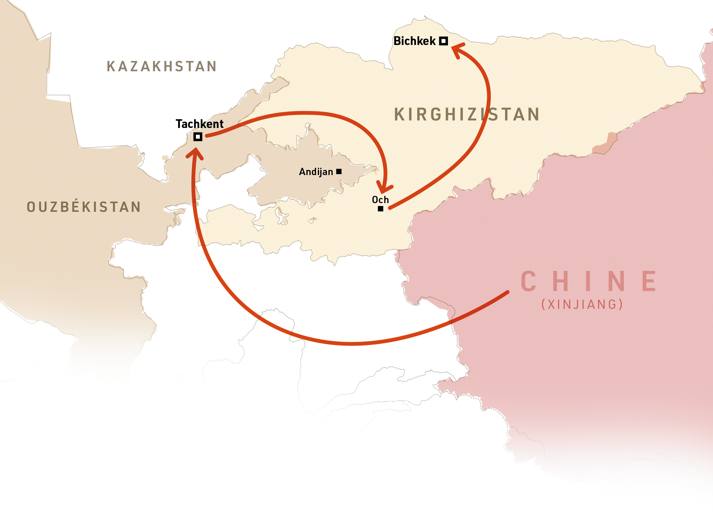 Le 23 mars, des étrangers débarquent dans le commissariat : le KGB kirghize. « J’ai vu de mes yeux un de leurs officiers remettre 1 000 soms [28 euros à l’époque] aux policiers ouzbeks. Ils ont compté l’argent devant moi. Je comprenais que les policiers ouzbeks me vendaient aux kirghizes », rapporte Behremjan. Depuis 1996, les deux pays collaborent étroitement dans le cadre du « groupe de Shanghai », une alliance « antiterroriste » entre la Chine, la Russie, le Tadjikistan et le Kazakhstan. Mais cette alliance est surtout un redoutable outil répressif transnational, qui vise particulièrement les Ouïghours et permet aux pays membres d’extrader d’un pays à l’autre les militants politiques – ou toute personne désignée comme telle.