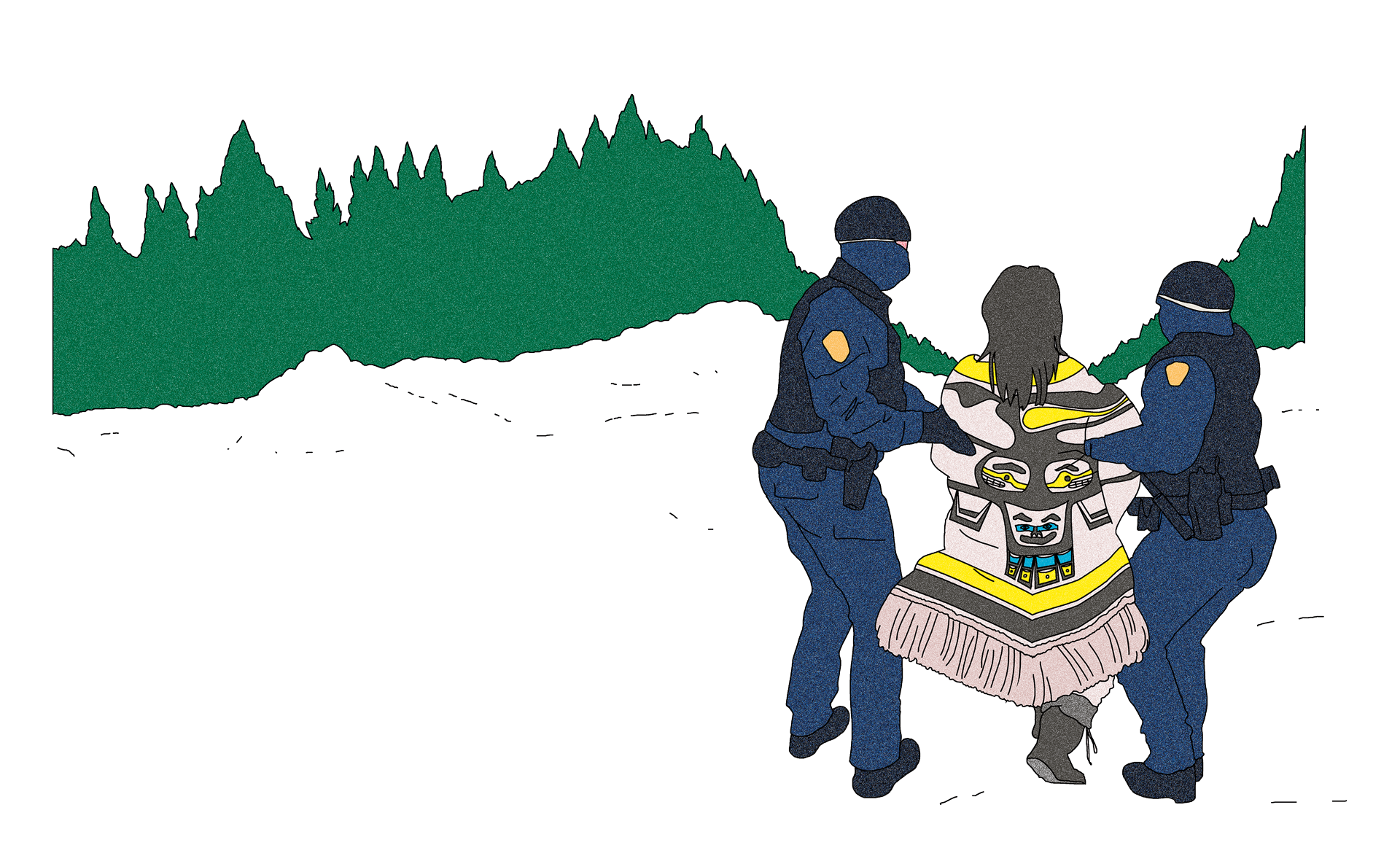 Je voulais créer un précédent, leur montrer qu’on n’allait pas se laisser faire sans lutter. Les promoteurs du projet ont tout fait pour nous rendre la vie infernale et nous pousser à partir. Les entreprises ont embauché des sociétés de sécurité privées, les autorités ont déployé le Community Industry Response Group [rebaptisé Critical Response Unit – British Columbia, en 2024], une unité de la police montée d’État au service de l’industrie. Nous ne pouvions aller nulle part sans être suivis, filmés, harcelés. J’ai moi-même été arrêtée deux fois. Je suis convaincue que les mesures extrêmes prises contre nous étaient censées intimider les autres peuples autochtones, les dissuader de se rebeller.