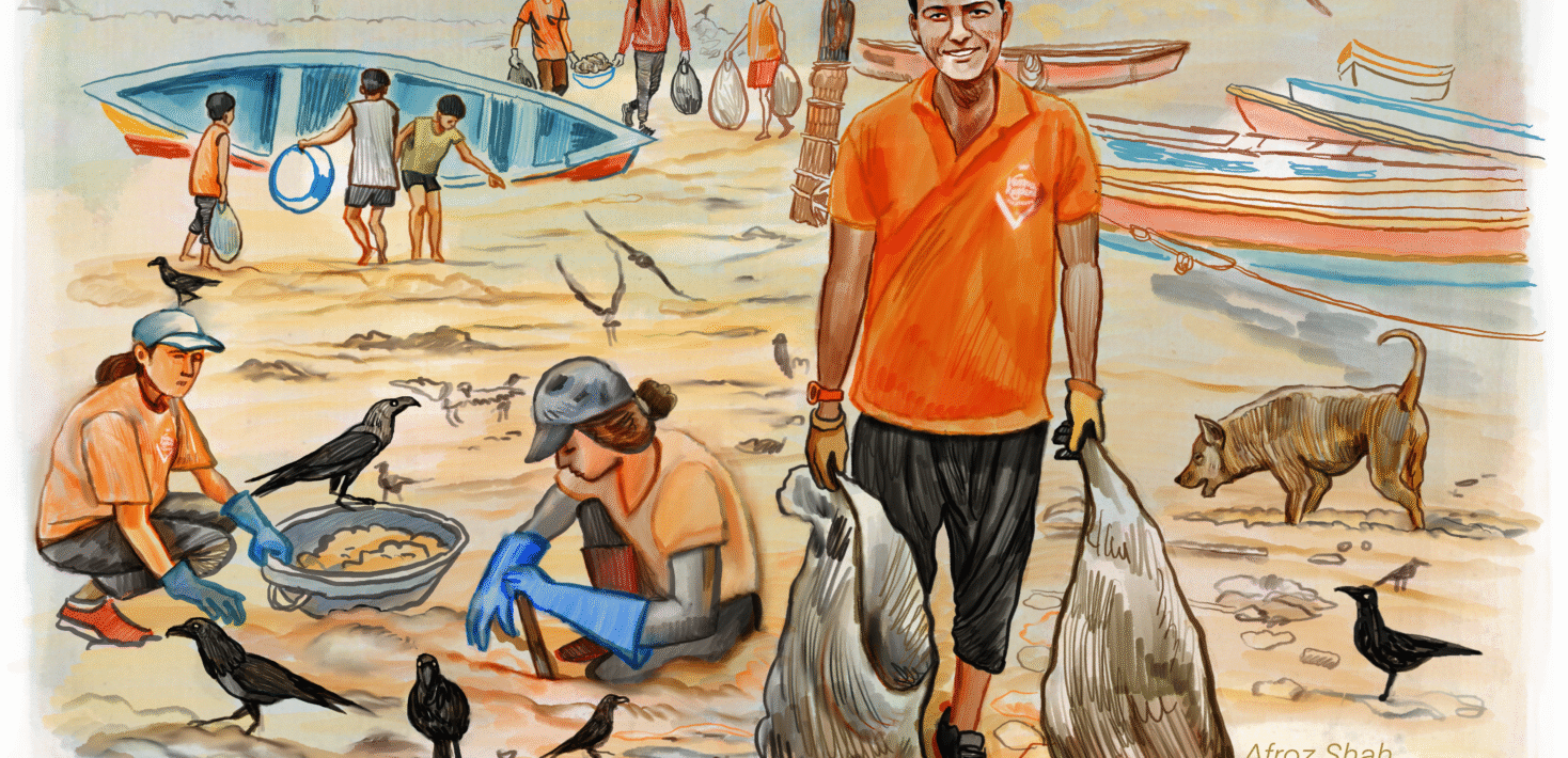 Afroz se lance à la recherche de bénévoles. Durant des semaines, il mobilise son réseau, sollicite des ONG, supplie les pêcheurs de l’aider. En vain. Personne ne semble prêt à s’engager. Ses amis sont trop occupés, les ONG déjà débordées et les pêcheurs jugent le projet irréaliste : « Ramasser les ordures ne nourrira pas nos familles. » Seul un voisin, Harbansh Mathur, 84 ans, accepte de l’accompagner sur la plage. En octobre 2015, armés de gants et de sacs-poubelle, Afroz et Harbansh commencent à plonger leurs mains dans la montagne de détritus.