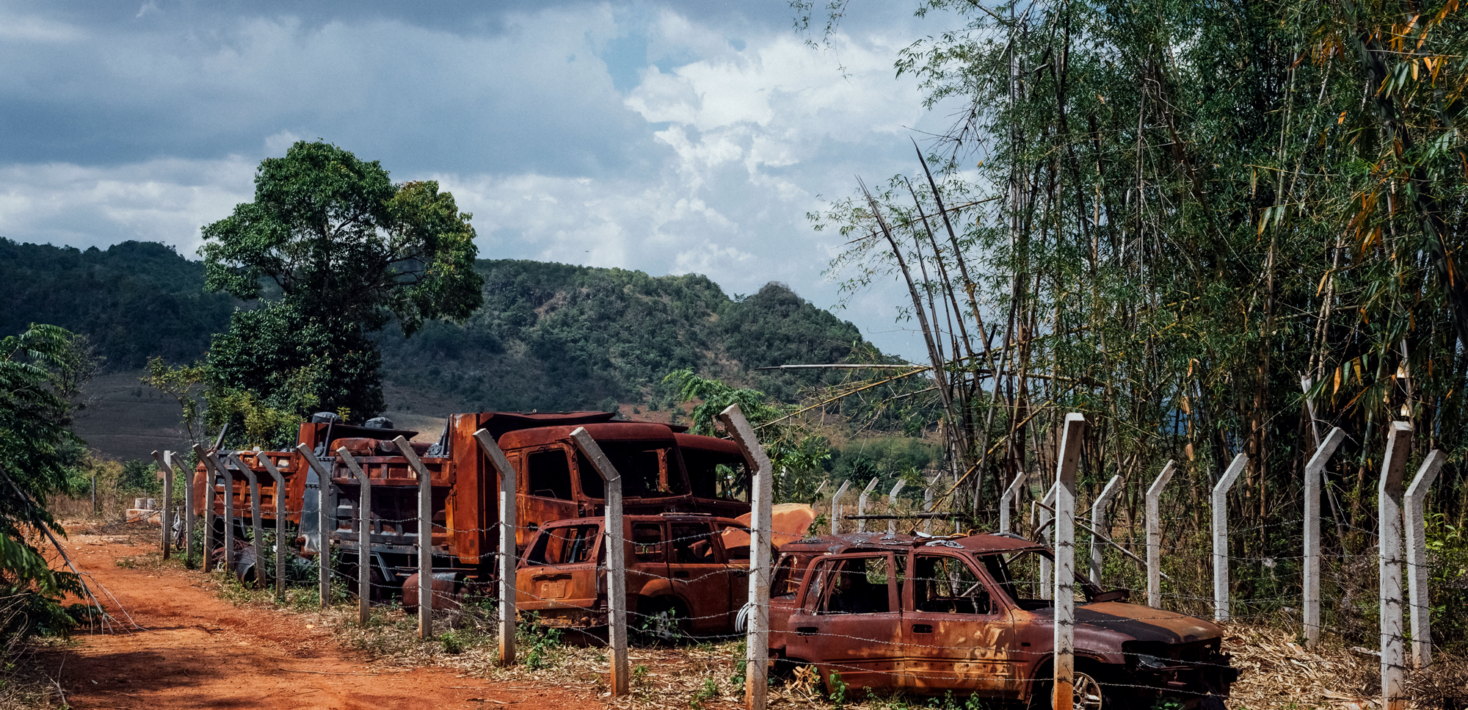 Nous sommes retournés à Moso. Deux ans et demi après la tuerie, la dizaine de véhicules calcinés n’a pas bougé, rongés par la rouille et la végétation, alignés comme un cortège. En tête, deux carcasses de voitures, puis deux camions, des pick-up, des motos, un tracteur… Un embouteillage funèbre. Les deux poids lourds, propriétés d’un homme d’affaires de Loikaw, transportaient les tonneaux d’essence utilisés pour mettre le feu. La plupart sont toujours là, complices muets, vides et éventrés. « On ne peut pas rester plus longtemps, il y a une base militaire pas loin », prévient un soldat de la Force de défense des nationalités karenni (KNDF) qui nous accompagne. Pour garder la scène intacte, les combattants anti-junte ont dressé autour d’elle une clôture de barbelés. Un détail attire l’œil : un inconnu a pendu au fil de fer un collier de perles blanches, en mémoire de celle ou de celui qui le portait.