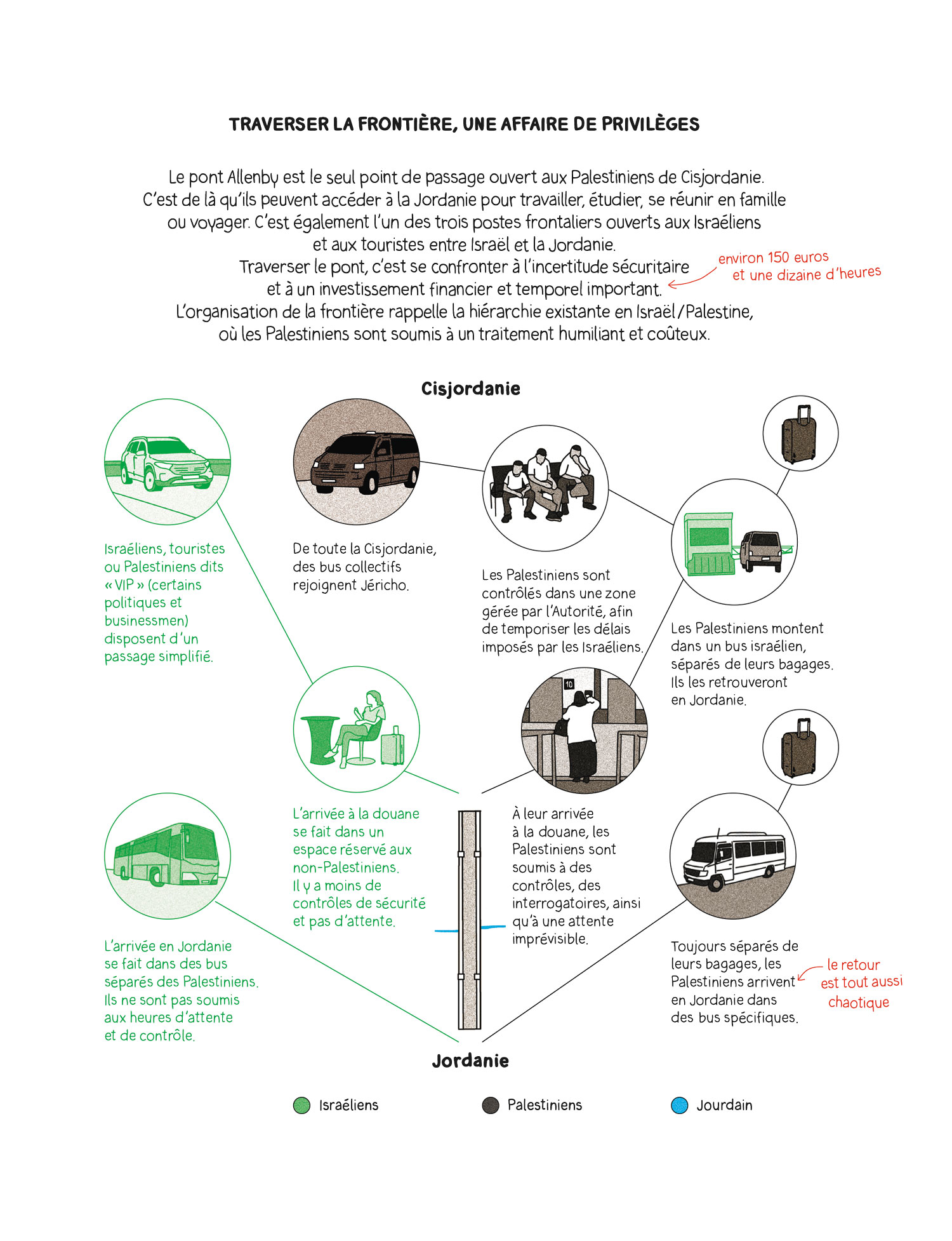 Les Palestiniens de Jérusalem ont un statut encore plus précaire : ils sont des apatrides. Ils ne sont pas citoyens israéliens, mais seulement résidents permanents, un statut révocable à tout moment, par exemple s’ils s’absentent du pays pour étudier à l’étranger. Enfin, les Palestiniens de la bande de Gaza et de Cisjordanie ont des documents fournis par l’Autorité palestinienne. Mais pour emprunter certaines routes, accéder à leur champ de l’autre côté du mur de séparation, se rendre en Israël pour travailler, se soigner, voyager, etc., ils dépendent de permis délivrés par une « administration civile » qui est en réalité un département de l’armée israélienne. Ils relèvent exclusivement de la justice militaire israélienne et peuvent être placés en détention administrative sans accusation ni procès et sans limite de temps par les autorités israéliennes.