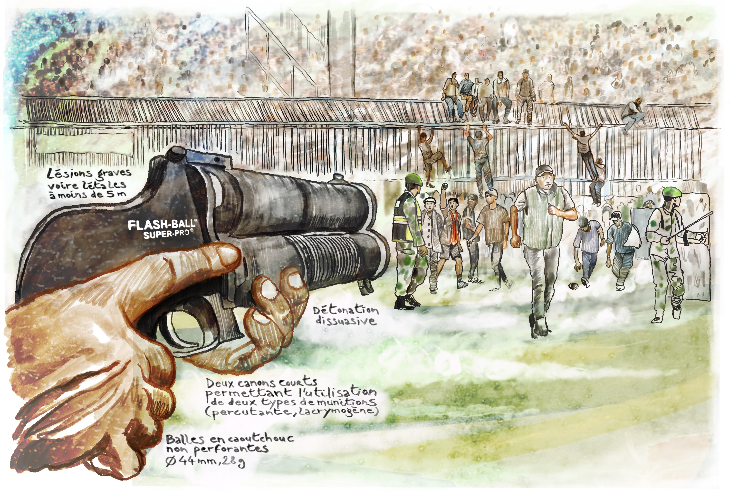 Ce n’est pas la première fois que le gouvernement français laisse exporter, sans restriction, une arme de maintien de l’ordre vers un pays qui l’utilise pour réprimer dans le sang une manifestation. En septembre 2019, en Indonésie, des milliers de Papous manifestent contre le racisme. Les policiers indonésiens tirent des gaz lacrymogènes, et tuent trois étudiants en les visant avec des balles en caoutchouc. Amnesty International alerte sur la situation en Papouasie, que le monde entier connaît désormais. Et pourtant… Trois mois plus tard, entre janvier 2020 et mars 2021, la firme stéphanoise Verney-Carron (aujourd’hui Lebel) envoie par avion 450 Flash-Ball à Jakarta pour augmenter les stocks de la police indonésienne 2 . Il s’agit de Flash-Ball « Super-pro 2 » à deux canons superposés, capables de lancer aussi bien une grenade lacrymogène qu’une balle en caoutchouc. Une fois encore, le gouvernement français – celui d’Édouard Philippe – a signé l’autorisation d’exporter en sachant que l’acheteur pouvait tuer avec ces armes. Le résultat ne se fait pas attendre. Un an et demi plus tard, le 1 er octobre 2022, une brigade indonésienne équipée de Flash-Ball français intervient dans un stade de Malang (Java oriental), où s’achève un match de football. Voyant des supporters du club perdant envahir la pelouse, ces policiers tirent une, puis deux, puis 45 salves de grenades lacrymogènes. Une violation dangereuse des règles de la FIFA 3 et des lois internationales interdisant de lancer des gaz dans une enceinte sportive ou un lieu clos. Les gaz recouvrent les gradins. Les spectateurs fuient dans tous les sens pour échapper à l’asphyxie : 125 personnes, dont 32 enfants, meurent piétinées par la foule 4 .