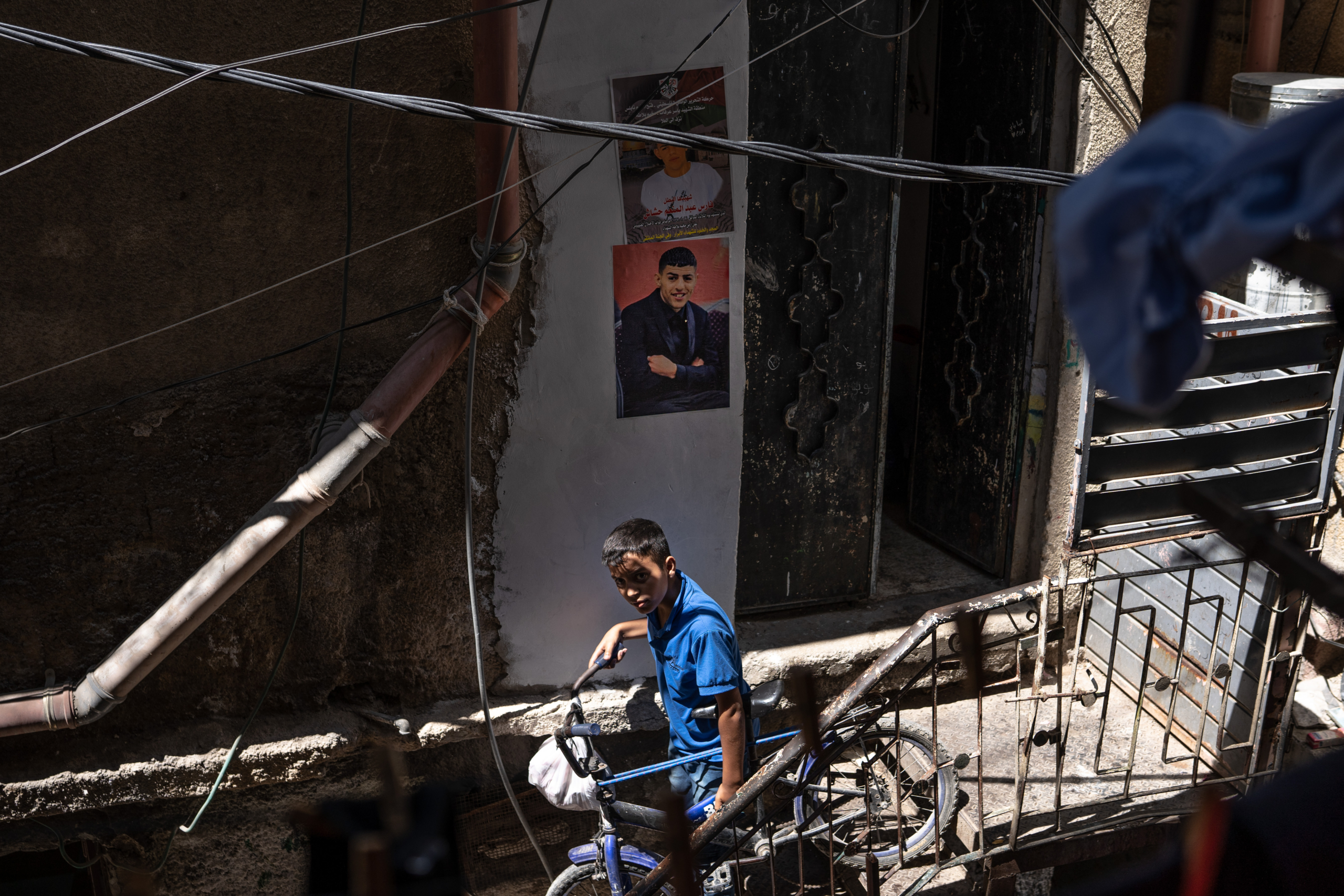 22 juin 2023, Naplouse. Un enfant sort de chez lui dans le camp de réfugiés de Balata. À l’entrée de la maison, une affiche de Fares Hashash, 20 ans, tué dans le camp.