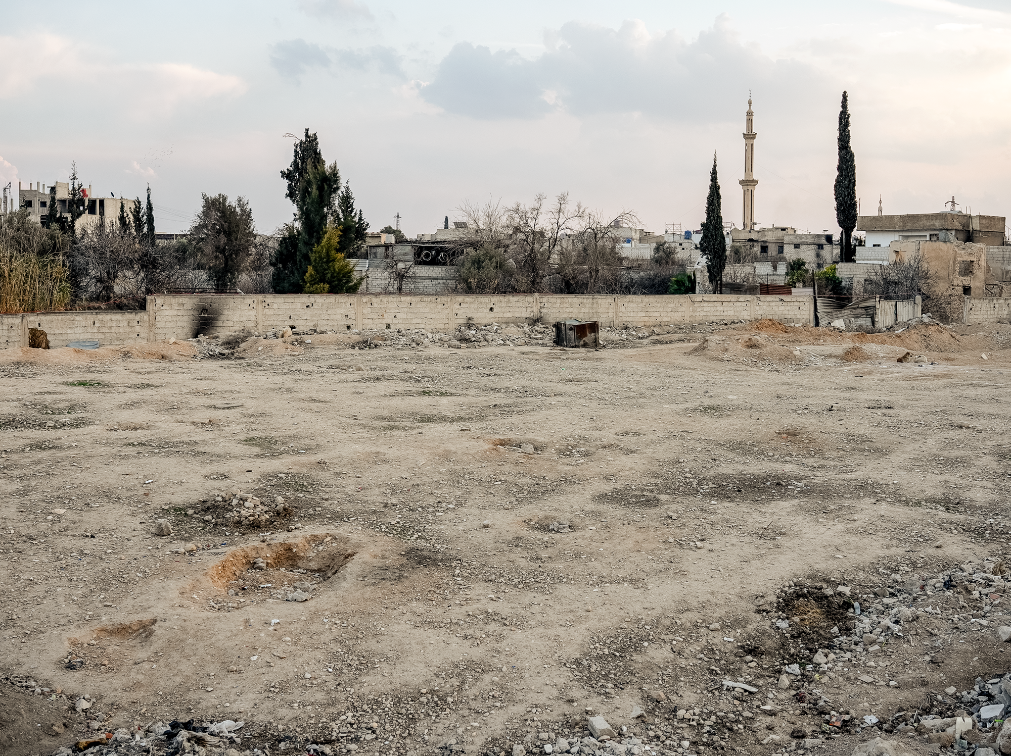 C’est sur ce terrain vague de Douma qu’ont été inhumées les victimes de l’attaque du 7 avril 2018. Quelques jours plus tard, le régime les a déterrées et les a fait disparaître on ignore où. Le CVDCS le soupçonne d’avoir voulu soustraire des corps contaminés par le chlore aux enquêtes médico-légales.