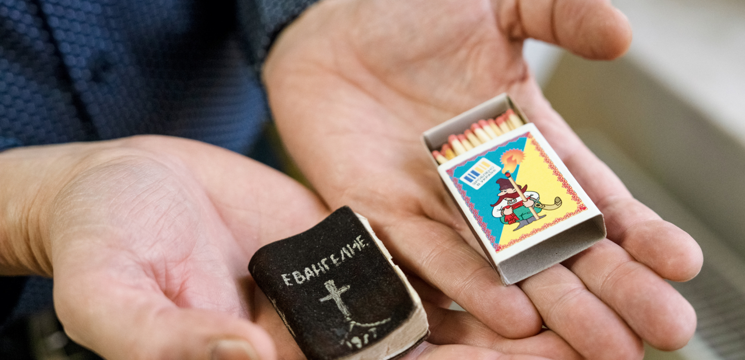 Les trois objets tiennent dans une pochette : une nappe en tissu mauve, brodée en 1914, utilisée durant les communions ; une boîte d’allumettes aux couleurs de l’Ukraine renfermant un Nouveau Testament, cadeau d’un pasteur emprisonné sous Staline ; un diapason pour accorder les voix des chœurs. Ces objets sont tout ce que le pasteur protestant Mykhailo Brytsyn a réussi à sauver de son église de Mélitopol, une ville de la région de Zaporijia prise par les autorités russes il y a deux ans.