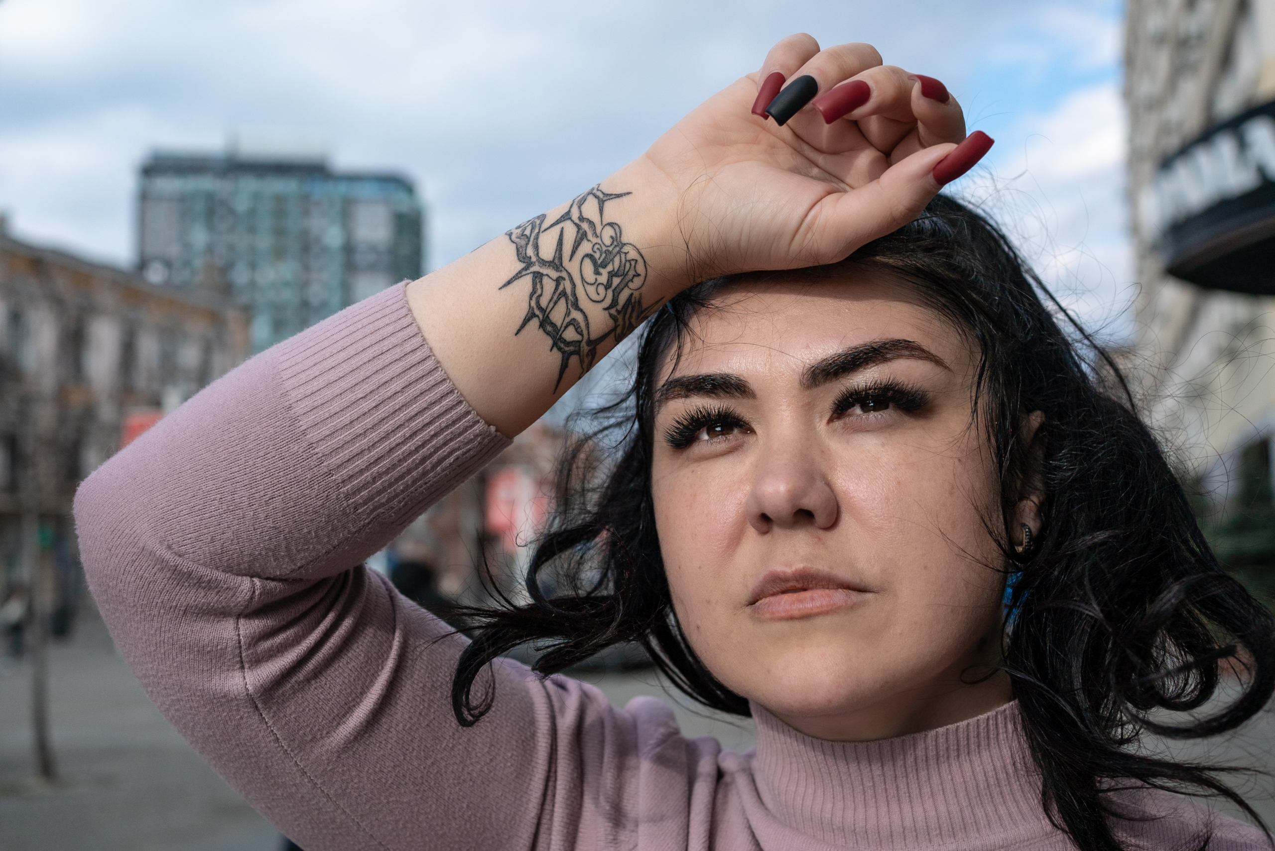 Roxana Leshchenko attend depuis deux ans la libération de son mari, Mykola. Elle s’est fait tatouer des épines qui encerclent l’initiale du disparu. Dnipro, le 10 mars 2024.