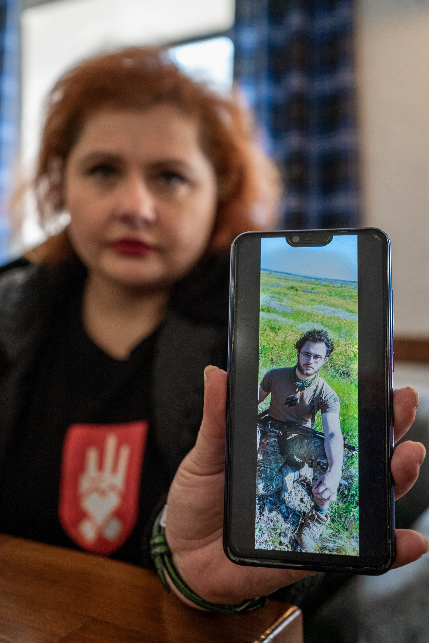 Natalia Kolemensla montre une photo de son fils, Gleb Prilipko, 20 ans, arrêté le 19 mai 2022. Natalia ne sait pas où son fils est détenu. Il l’a appelée une fois depuis Olenivka pour lui dire qu’il avait perdu 15 kilos et vomissait continuellement.