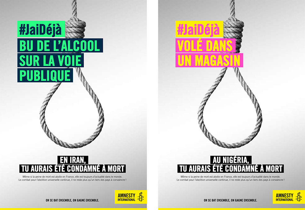 Ce concept a pour objectif de leur faire prendre conscience d’une façon décalée que des personnes se font encore condamner à mort dans d’autres pays. Une campagne d’affichage qui cherche à les interpeller sur la réalité de la peine capitale dans le monde. Que notre cible puisse s’identifier à ce « #JaiDéjà » et qu’un effet miroir se produise pour susciter une prise de conscience.