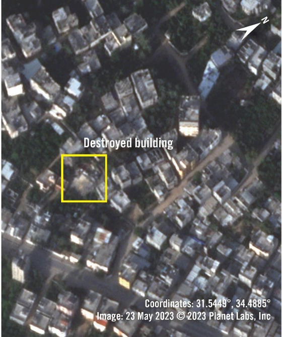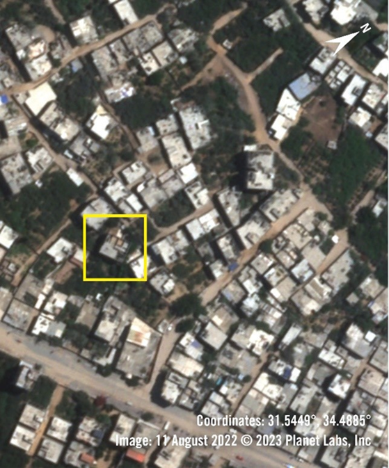 Légende : Camp de réfugiés de Jabalia, Gaza : L’image satellite ci-dessus montre un bâtiment dans la zone du camp de réfugiés de Jabalia le 11 août 2022 (au dessus). Le 23 mai 2023 (en dessous), les images montrent que le bâtiment est aplati et que des débris entourent la zone.
