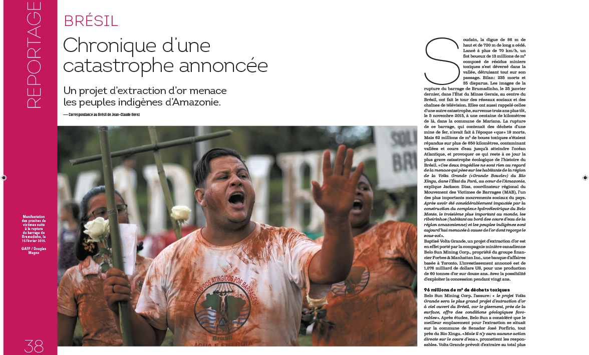 Le nouveau président brésilien Jair Bolsonaro n’avait pas caché son intention : l’industrie passera avant l’environnement et les indigènes n’auront pas voix au chapitre. Le méga projet d’une entreprise canadienne menace d’ores et déjà l’Amazonie. Celle-ci ambitionne d’implanter une exploitation d’or à quelques kilomètres d’une réserve indigène. Apres deux catastrophes écologiques, qui ont en partie défiguré la forêt, ce nouveau projet risque de lui être fatal tant les produits utilisés pour l’extraction du minerai sont toxiques. Dans ce combat inégal, les populations autochtones se battent avec les moyens du bord et, n’en déplaise à Bolsonaro, elles n’ont pas dit leur dernier mot.