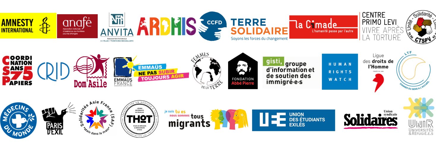 Liste des organisations signataires : Amnesty International France, Anafé, ANVITA, ARDHIS, CCFD-Terre Solidaire, Cimade, Centre Primo Levi, Collectif des travailleurs sans-papiers de Vitry, Coordination des sans-papiers 75, CRID, Dom’Asile, Emmaüs France, Femmes de la Terre, Fondation Abbé Pierre, Gisti, Human Rights Watch, Ligue des Droits de l’Homme, LTF, Médecins du Monde, Paris d’Exil, Solidarité Asie France, Thot, Tous migrants, Union des étudiants exilés, Union syndicale Solidaires, UniR