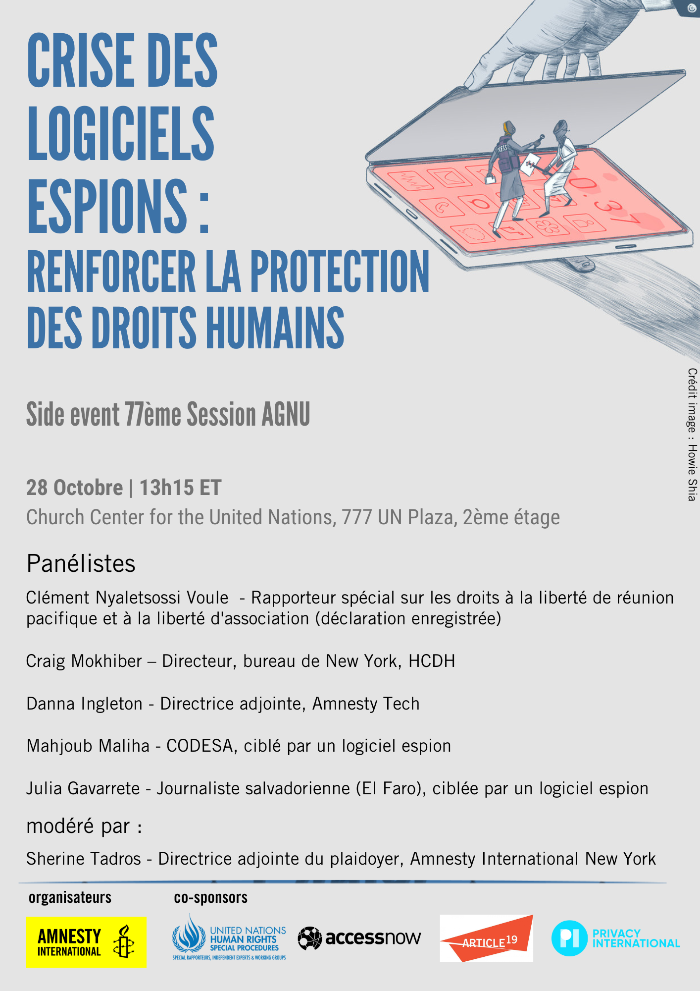 L’Assemblée générale des Nations unies débattra bientôt de la résolution sur la vie privée à l’ère du numérique. A cette occasion, une délégation d’Amnesty International France sera à l’ONU, à New York, afin de convaincre les États d’y inclure des mesures de protection des droits humains face aux dangers de la surveillance numérique ciblée. Ce vendredi 28 novembre 2022 à 13h, l’ONG convie la presse et les délégués à un « side event » qui se déroulera dans les bureaux d’Amnesty UN en présence de Julia Gavarrete – Journaliste salvadorienne (El Faro) et Mahjoub Maliha de CODESA, DDH du Sahara occidental, tous les deux ciblés par un logiciel espion. Danna Ingleton, Directrice adjointe des programmes d’Amnesty Tech, et des experts de l’ONU interviendront également. En parallèle de cette conférence, sera remise la pétition Pegasus (100 000 signataires) aux représentants des États membres.