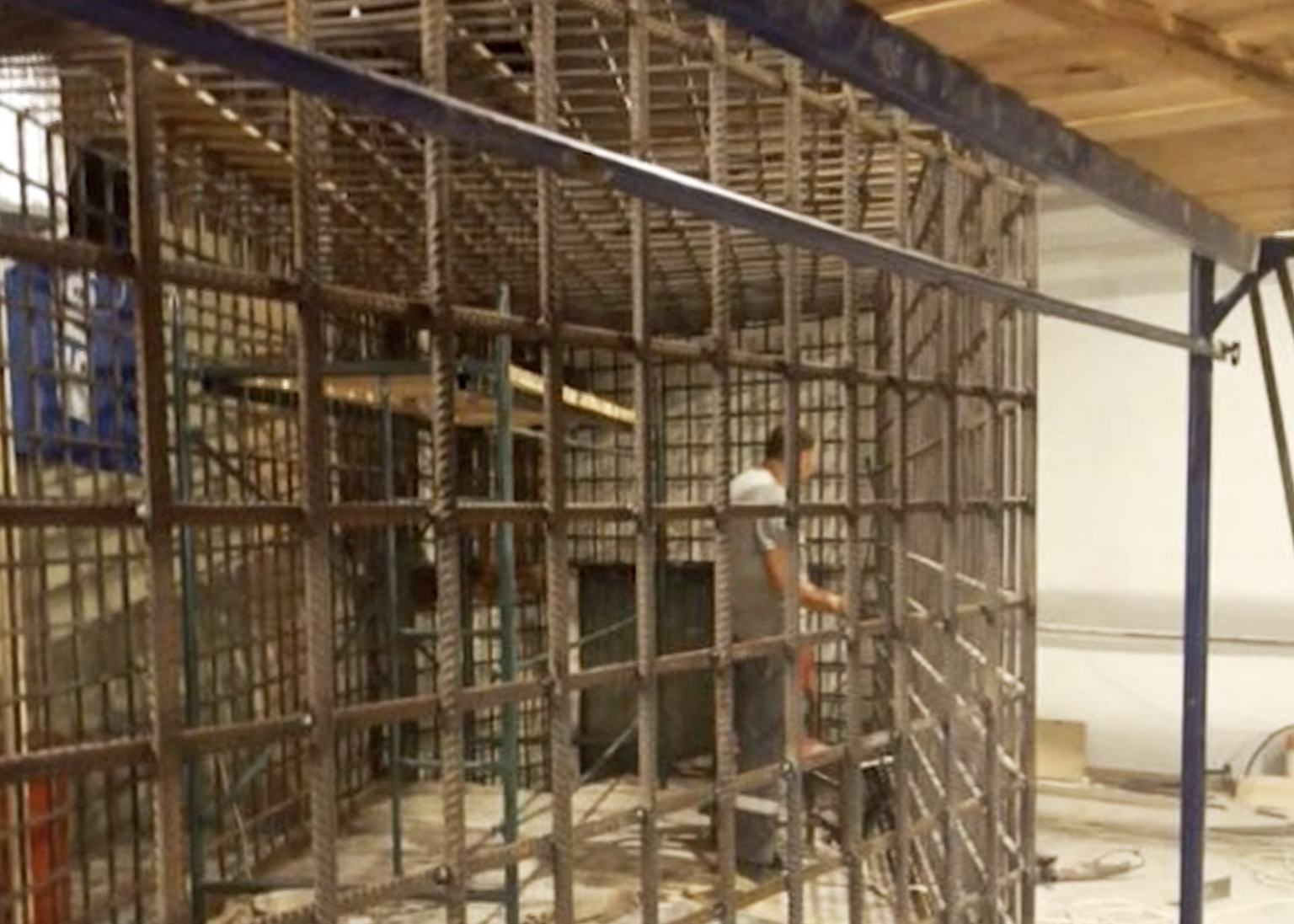 Capture d’écran d’une vidéo qui montre la construction de cages sur la scène de la salle philharmonique de Marioupol, Ukraine, août 2022.