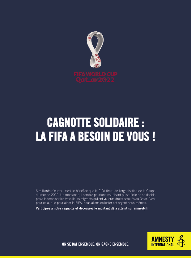 « La FIFA tirera 6 milliards d’euros de bénéfices de la Coupe du Monde 2022. Et pourtant, elle ne s’est toujours pas engagée à créer un fonds d’indemnisation pour les travailleurs migrants au Qatar.
