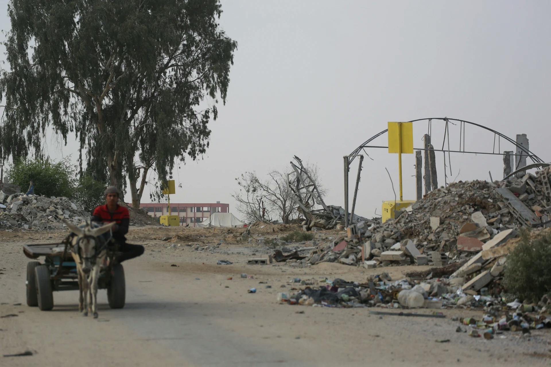 Un Palestinien se déplace sur une charrette tirée par un âne près d'un bloc de béton marquant la « ligne jaune » tracée par l'armée israélienne à Bureij, dans le centre de la bande de Gaza, le 4 novembre 2025. © BASHAR TALEB / AFP