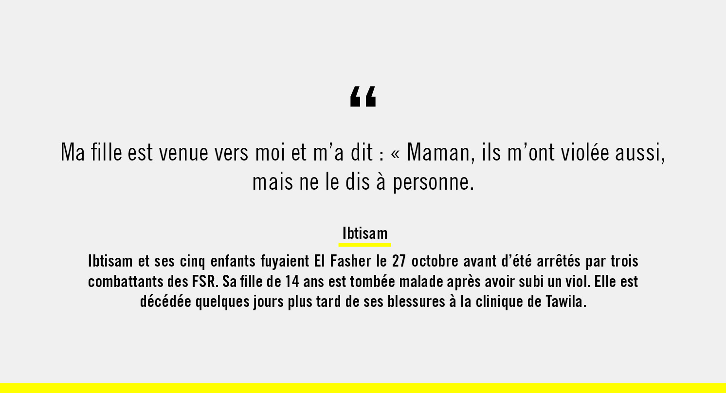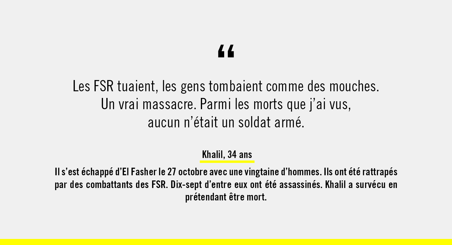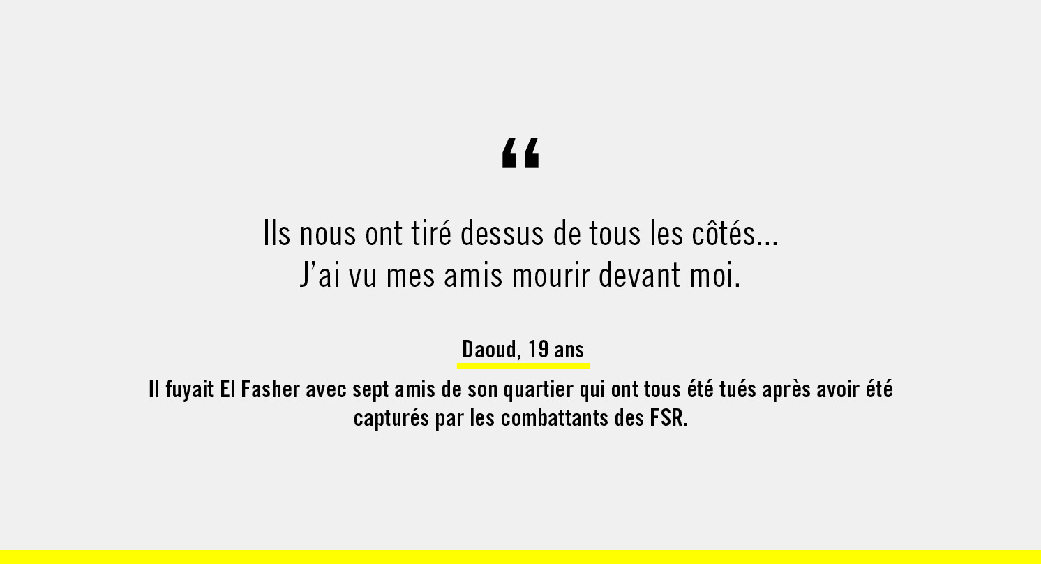 Mais certaines personnes n’avaient pas réussi à fuir la ville. 260 000 civil·es étaient encore pris au piège, coupé·es de toute aide humanitaire, lorsque la ville est tombée aux mains des FSR.