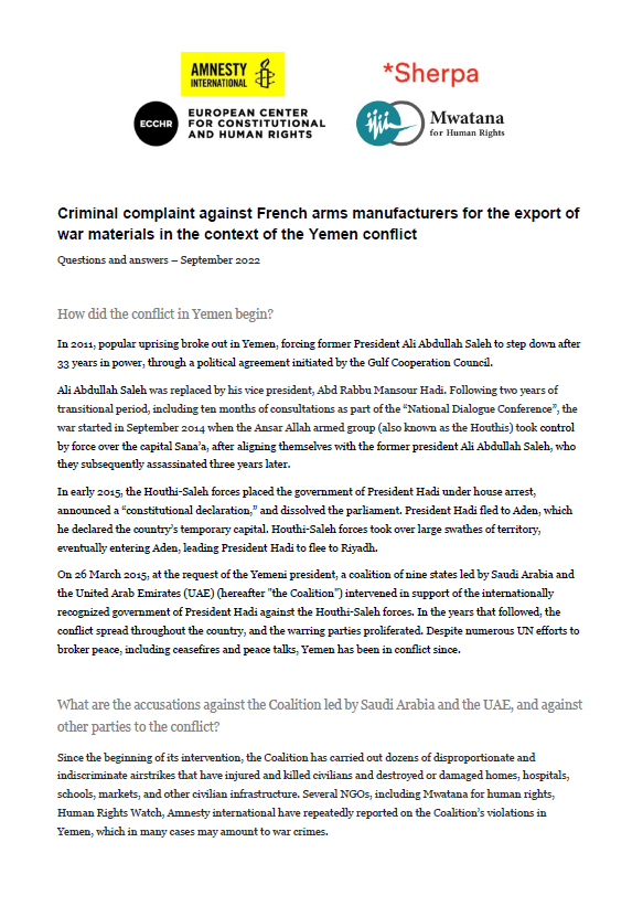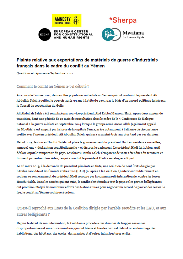 Malgré les preuves accablantes montrant que depuis 2015, la coalition a mené des frappes sans discrimination à l’encontre de la population civile au Yémen, durant la période de 2015 à 2020 le gouvernement français a perms que des entreprises françaises continuent de fournir à la Coalition du matériel de guerre, des munitions et des services de maintenance.