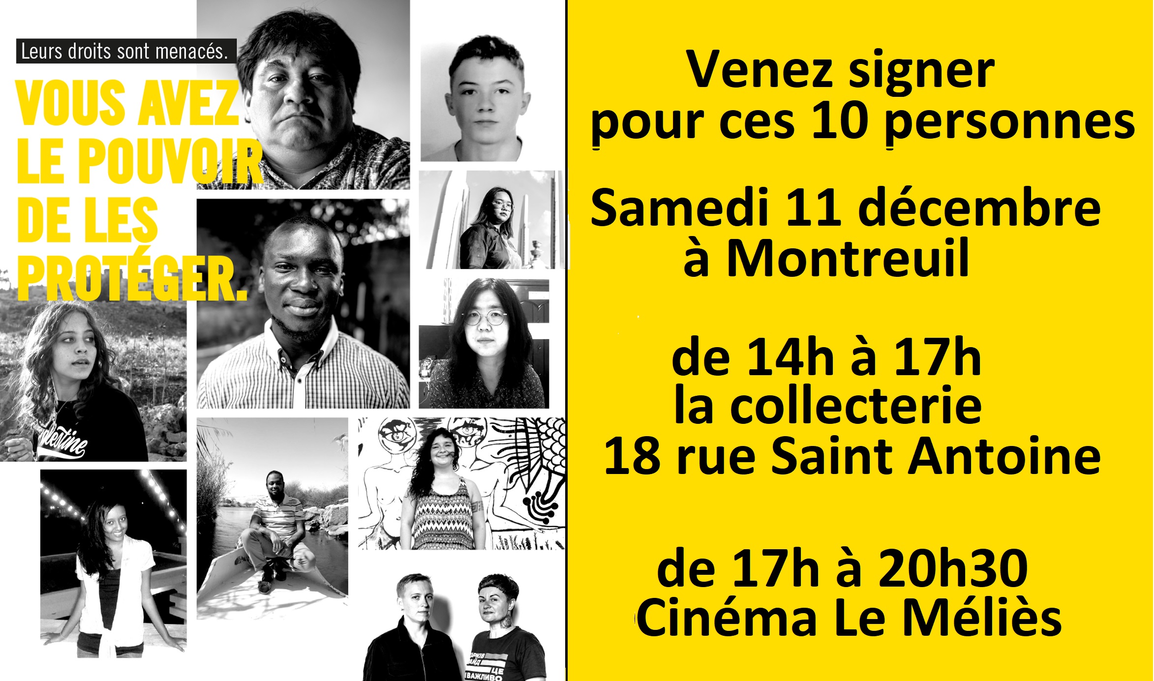 Recueil de signatures pour les 10 jours pour signer dans le hall du cinéma Le Méliès de 17h à 20h30.