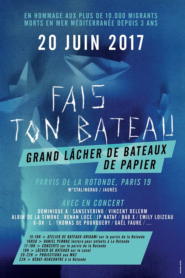 En hommage aux plus de 10000 migrants et réfugiés morts en mer Méditerranée depuis début 2016, rejoignez-nous pour l’évènement : « Fais ton bateau » Action citoyenne « Chacun est appelé à venir sur le canal de l’Ourcq à La Rotonde, pour fabriquer avec d’autres son bateau de papier et à venir le lâcher sur le canal… Nous sommes tous potentiellement un migrant, un exilé qui aura peut-être un jour besoin d’une main tendue. Nous l’avons été dans le passé et aux vues des dérèglements climatiques qui nous menacent tous, nous le serons probablement un jour dans le futur. Cet évènement vise à sensibiliser et à témoigner avec force de notre solidarité vis à vis des réfugiés. Soyons nombreux. » Emily Loizeau