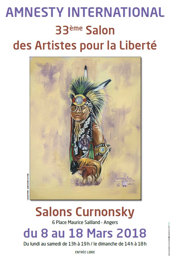 33ème salon « des artistes pour la liberté » du 8 mars au 18 mars, de 13 h à 19 h, Salons Curnonsky. Parmi les 85 artistes qui exposent cette année, il y a Leonard Peltier: un défenseur aux Etats-Unis des Amérindiens en lutte pour la reconnaissance de leurs cultures, de leurs langues et de leur identité. Emprisonné depuis 42 ans, Leonard Peltier purge deux peines de détention à perpétuité pour le meurtre de deux agents du FBI en 1975, crime qu’il a toujours nié être l’auteur. Son procès est truffé d’irrégularités: manipulation de témoin, preuves fabriquées, documents dissimulés à la défense… Leonard Peltier est considéré comme le plus ancien prisonnier politique au monde. Leonard Peltier est aussi un artiste: 5 toiles réalisées en prison seront exposées et l’argent récolté par la vente de ses œuvres lui sera intégralement reversé.
