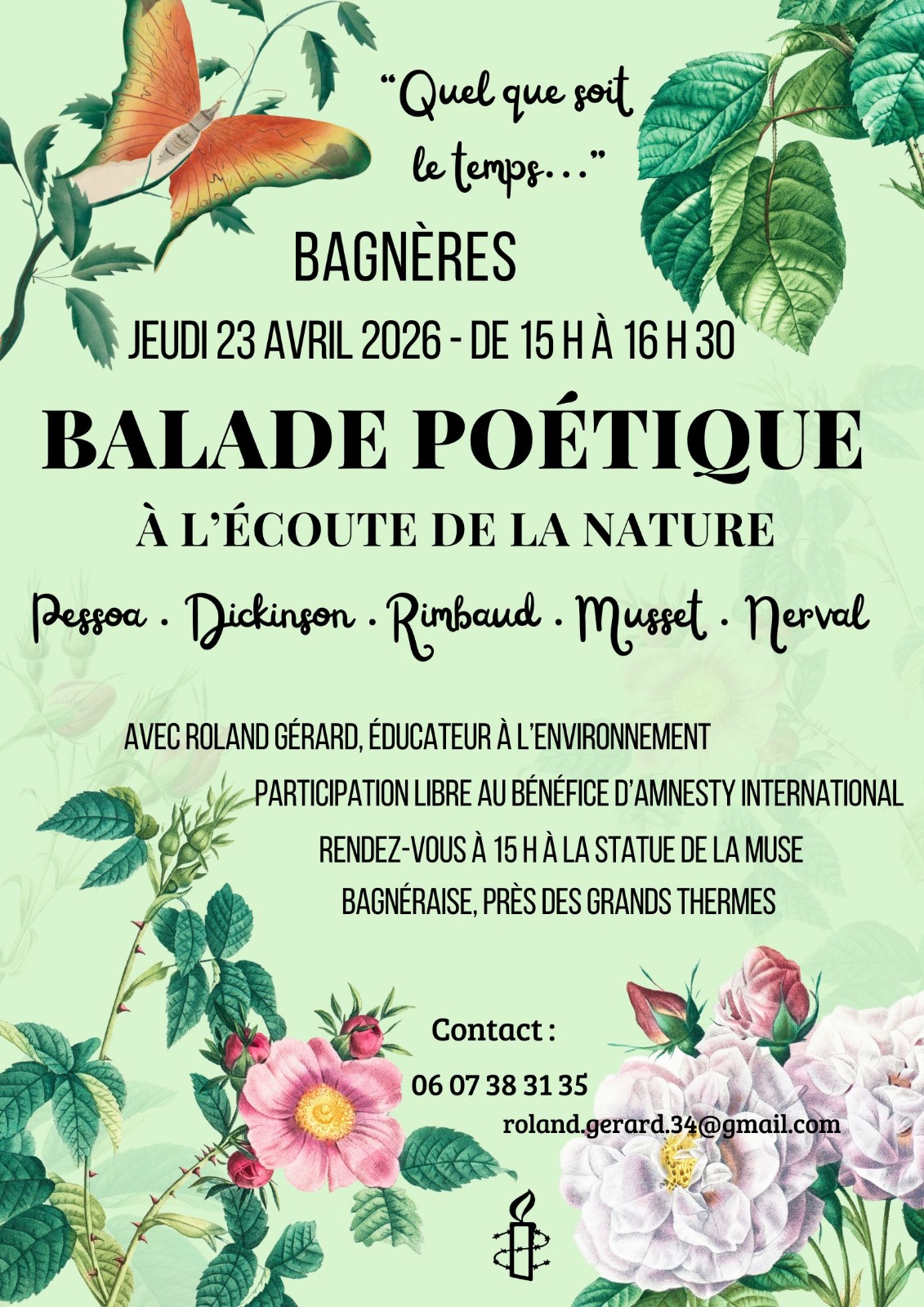 - Nous marchons dans un espace de nature. Nous touchons les feuilles, nous regardons les fleurs, nous faisons des points d’écoute pour saisir le chant des oiseaux… des poèmes de Fernando Pessoa, Emily Dickinson, Jean de la Fontaine, Gérard de Nerval, Arthur Rimbaud… nous accompagneront. Cette balade est une invitation à laisser un peu de côté notre mental pour augmenter notre présence au monde. Balade animée par Roland Gérard, animateur nature.