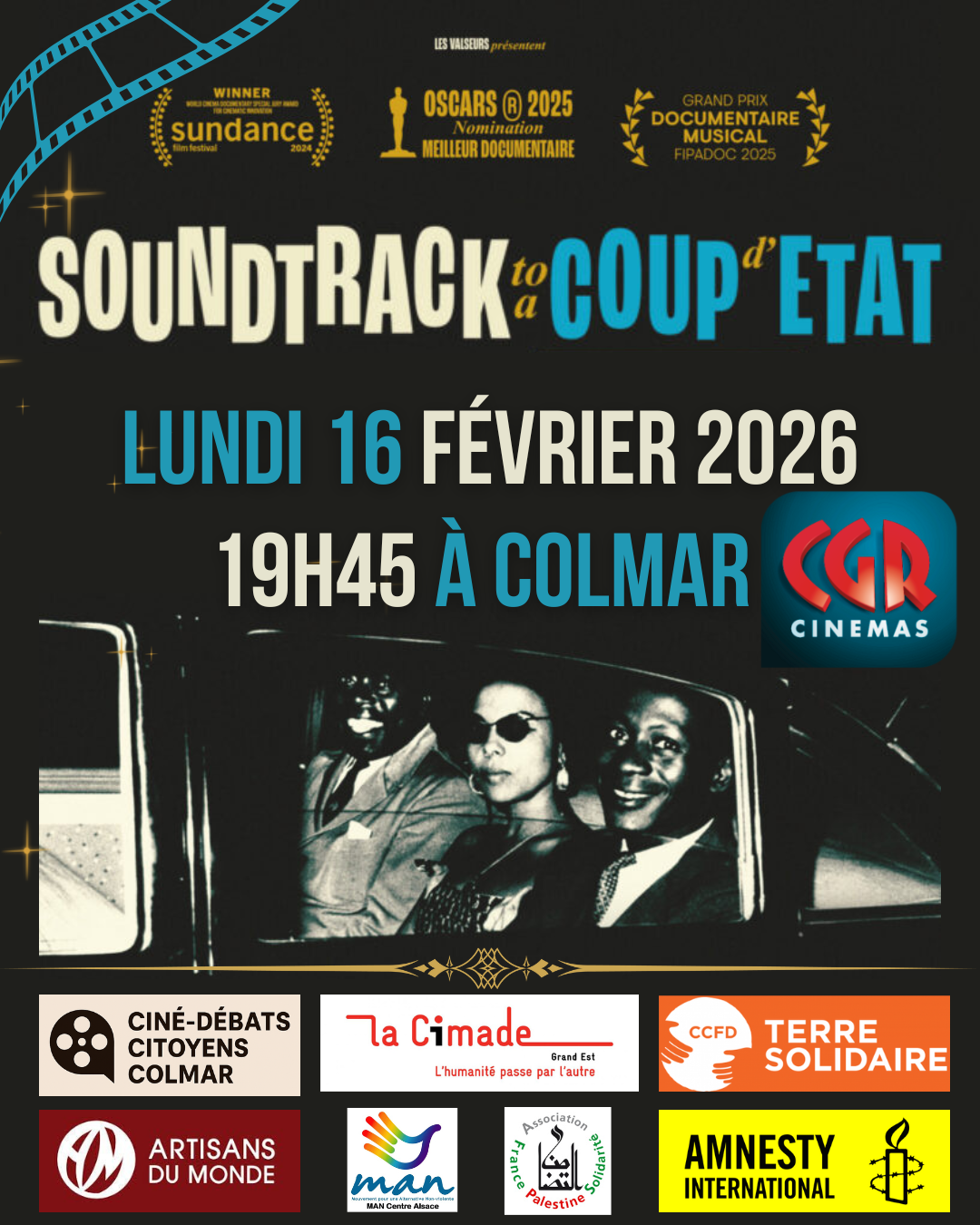 Le collectif Ciné-débats-Citoyens-Colmar, coordonné par le Groupe Amnesty de Colmar, propose une soirée exceptionnelle autour du documentaire Soundtrack to a Coup d’État, réalisé par Johan Grimonprez.