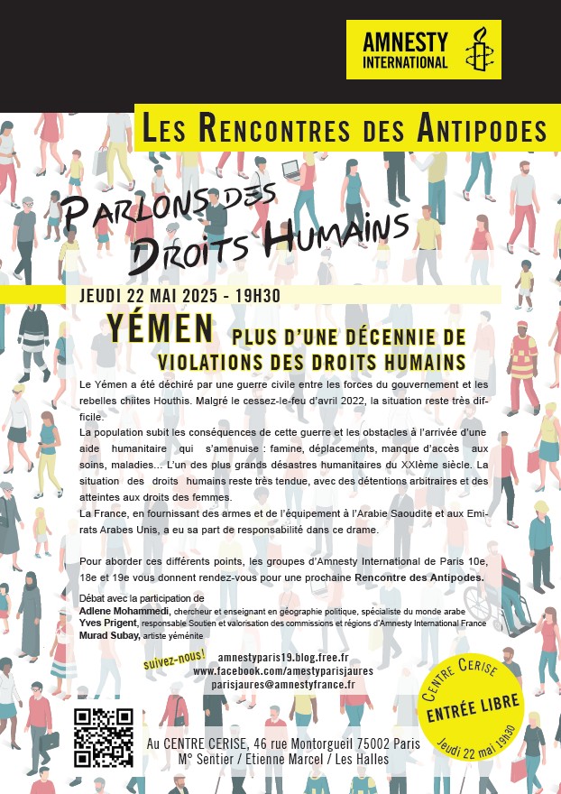 Yémen : plus d’une décennie de violations des droits humains Pendant près d’une décennie, le Yémen a été déchiré par une guerre civile entre les forces du gouvernement et les rebelles chiites Houthis. Malgré le cessez-le-feu d’avril 2022, la situation reste très difficile. La population subit toujours les conséquences de cette guerre et les obstacles à l’arrivée d’une aide humanitaire qui s’amenuise : famine, déplacements, manque d’accès aux soins, maladies… Il s’agit de l’un des plus grands désastres humanitaires du XXIe siècle. La situation des droits humains reste très tendue, avec des détentions arbitraires et des atteintes aux droits des femmes. La France, en fournissant des armes et de l’équipement à l’Arabie Saoudite et aux Émirats arabes unis, a eu sa part de responsabilité dans ce drame. Pour aborder ces points, les groupes d’Amnesty International de Paris 10e, 18e et 19e vous donnent rendez-vous pour une prochaine Rencontre des Antipodes en présence de : – Murad Subay, artiste yéménite – Adlene Mohammedi, chercheur et enseignant en géographie politique, spécialiste du monde arabe – Yves Prigent, responsable du programme Responsabilité des États et des entreprises d’Amnesty International France – 4e intervenant annoncé prochainement Un moment de convivialité est prévu à l’issue de la Rencontre. Jeudi 22 mai 2025 à 19h30 Salle Cerise, 46 rue Montorgueil à PARIS (75002) Métro : Sentier, Etienne Marcel ou les Halles Entrée libre Nous écrire : [email protected] Nous suivre : Instagram Facebook X