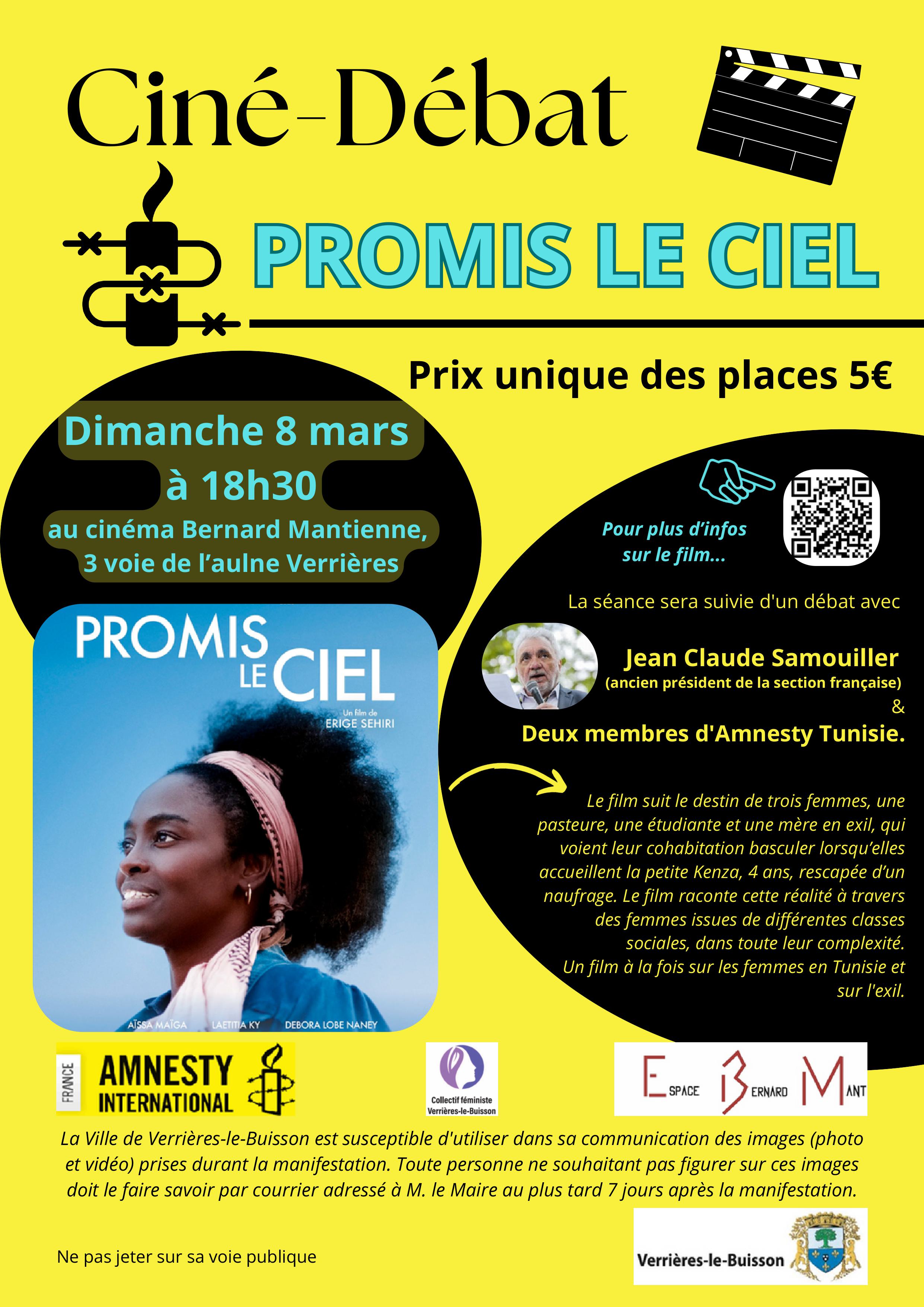 Débat autour du film « Promis le ciel » de Erige Sehiri avec Jean Claude Samouiller, Benoit Gosset (responsable Maghreb AIF) ,Fida Hammami chercheuse Tunisie. Le destin de 3 femmes en exil en Tunisie. Ce sera l’occasion d’aborder les thèmes des droits des femmes et des exilés en Tunisie.