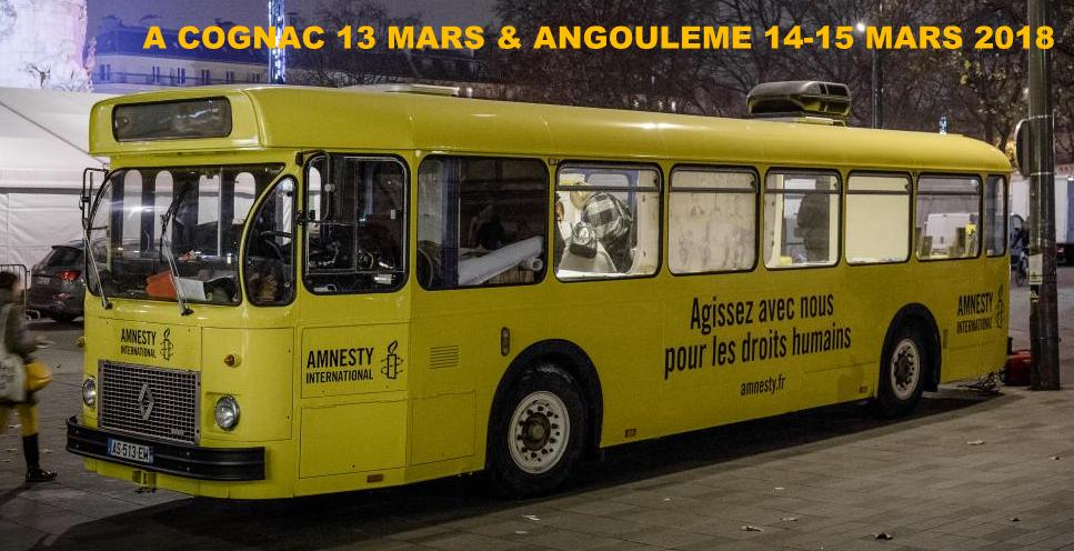 Exposition-débat de 9h à 18h sur la place d’Armes à Cognac, dans le cadre de la campagne mondiale I Welcome. Les membres d’Amnesty International invitent le public à découvrir l’exposition « Accueillons les réfugiés » À cette occasion, plusieurs activités artistiques et pédagogiques seront proposées au public autour du bus.