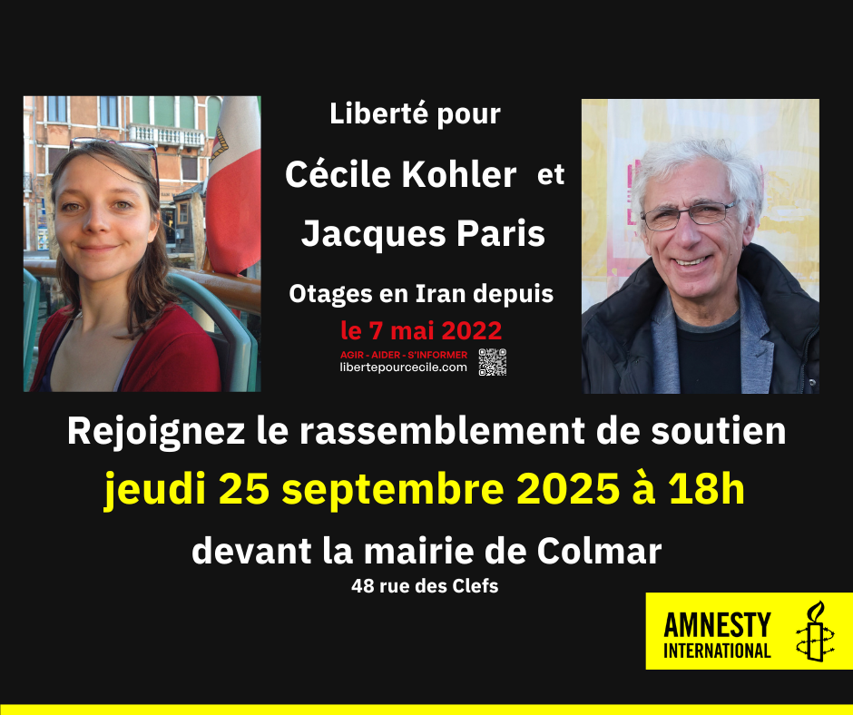 Avec Amnesty International, rejoignez le rassemblement de soutien à Cécile Kohler et Jacques Paris, toujours détenus arbitrairement en Iran. Leur liberté nous concerne toutes et tous : chaque voix compte pour rappeler qu’ils ne sont pas oubliés. Venez nombreux affirmer votre solidarité et exiger leur libération !