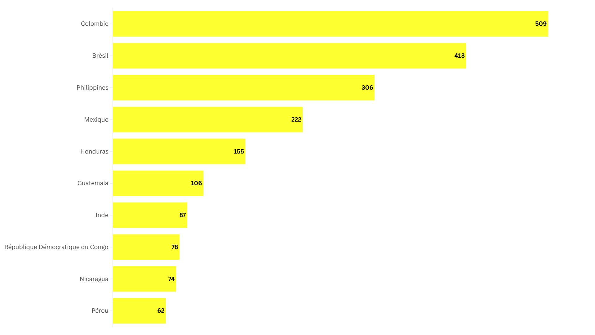 Classement des pays où il y a eu le plus de meurtres et de disparitions des défenseur·es de l’environnement entre 2012 et 2024 (données de Global Witness).