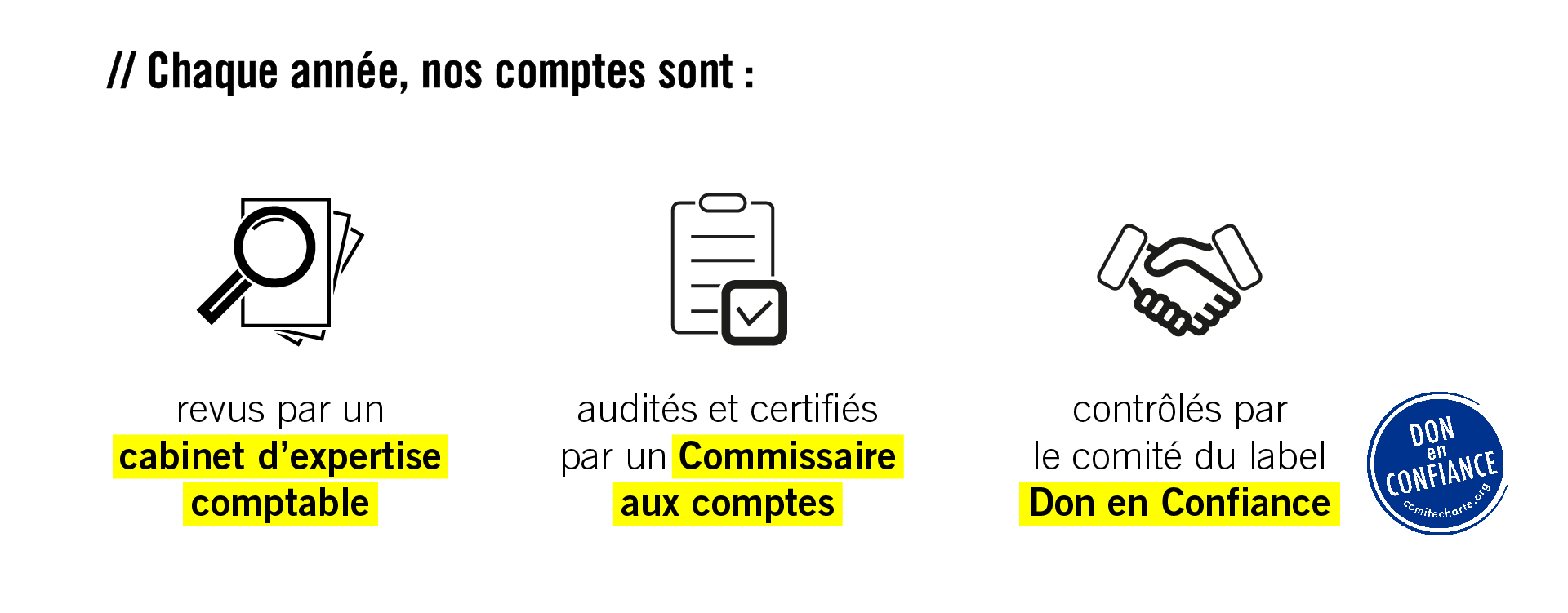 Une fois toutes les informations vérifiées et approuvées, elles sont rendues publiques et communiquées à l’ensemble de nos membres et donateurs.