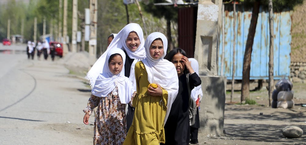 Des filles afghanes marche le long d'une route dans le quartier de Fayzabad dans la province du Badakhshan. 26 mars 2023, © Omer Abrar / AFP