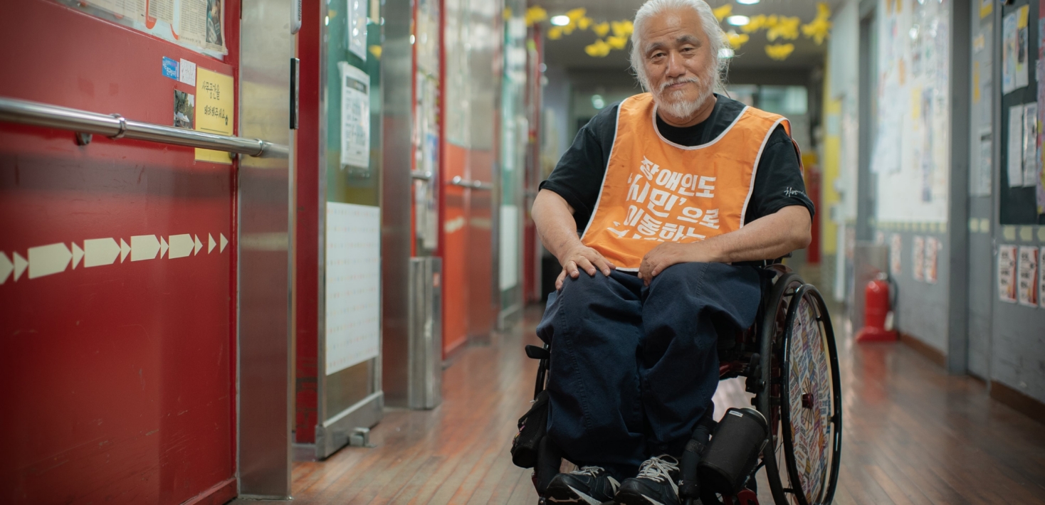 Kyung Seok Park milite depuis plus de 30 ans en faveur des droits des personnes en situation de handicap. Il est l’une des figures de l’association Solidarité contre la discrimination liée au handicap, un mouvement engagé dans la lutte contre la stigmatisation des personnes en situation de handicap, et qui milite pour leurs droits à la mobilité, à l’éducation et au travail.